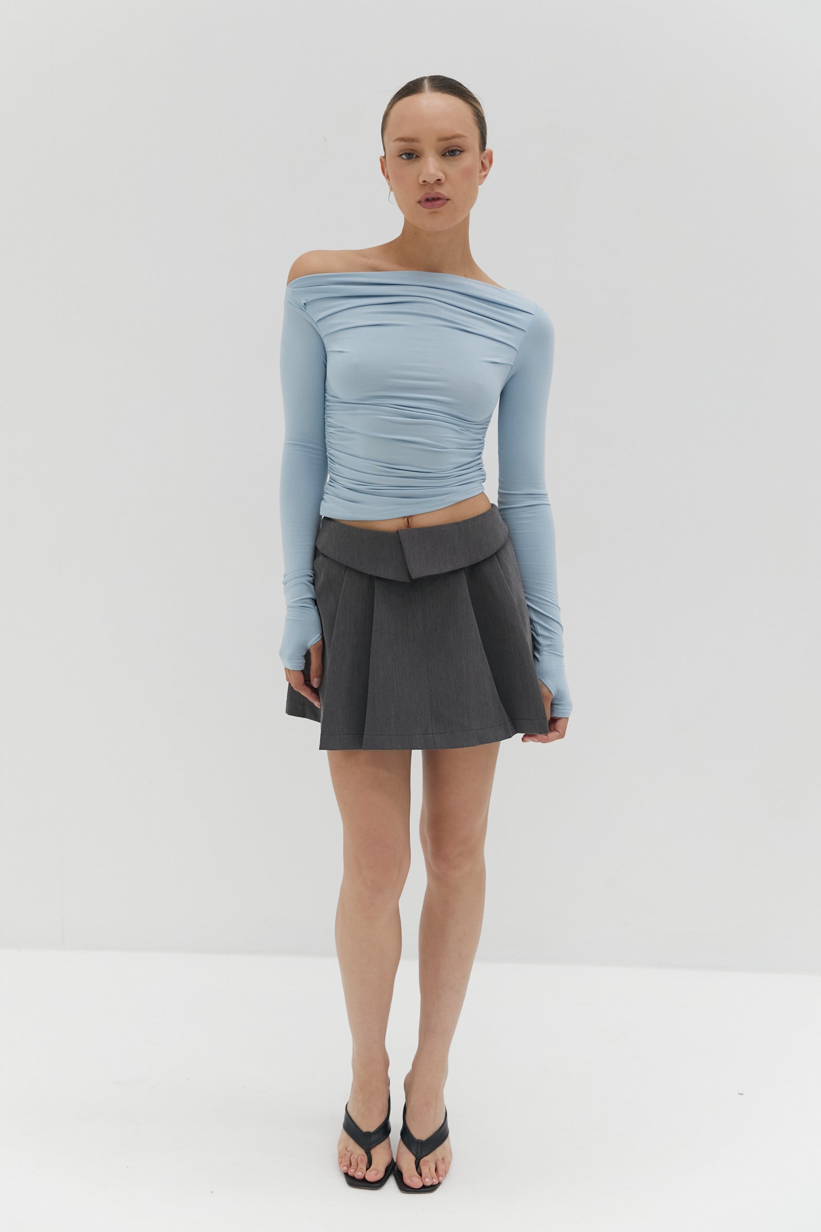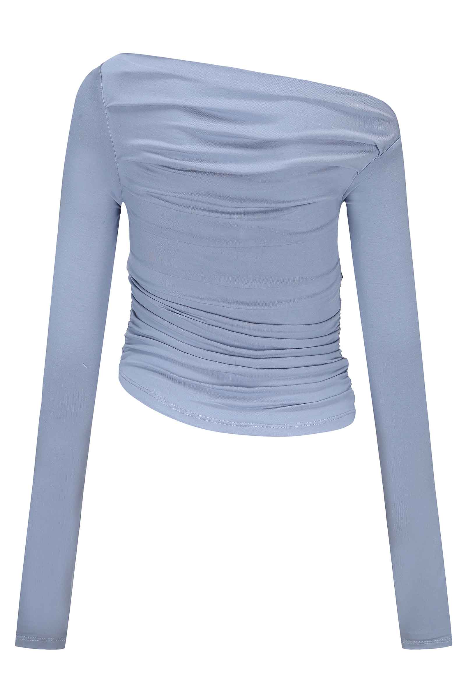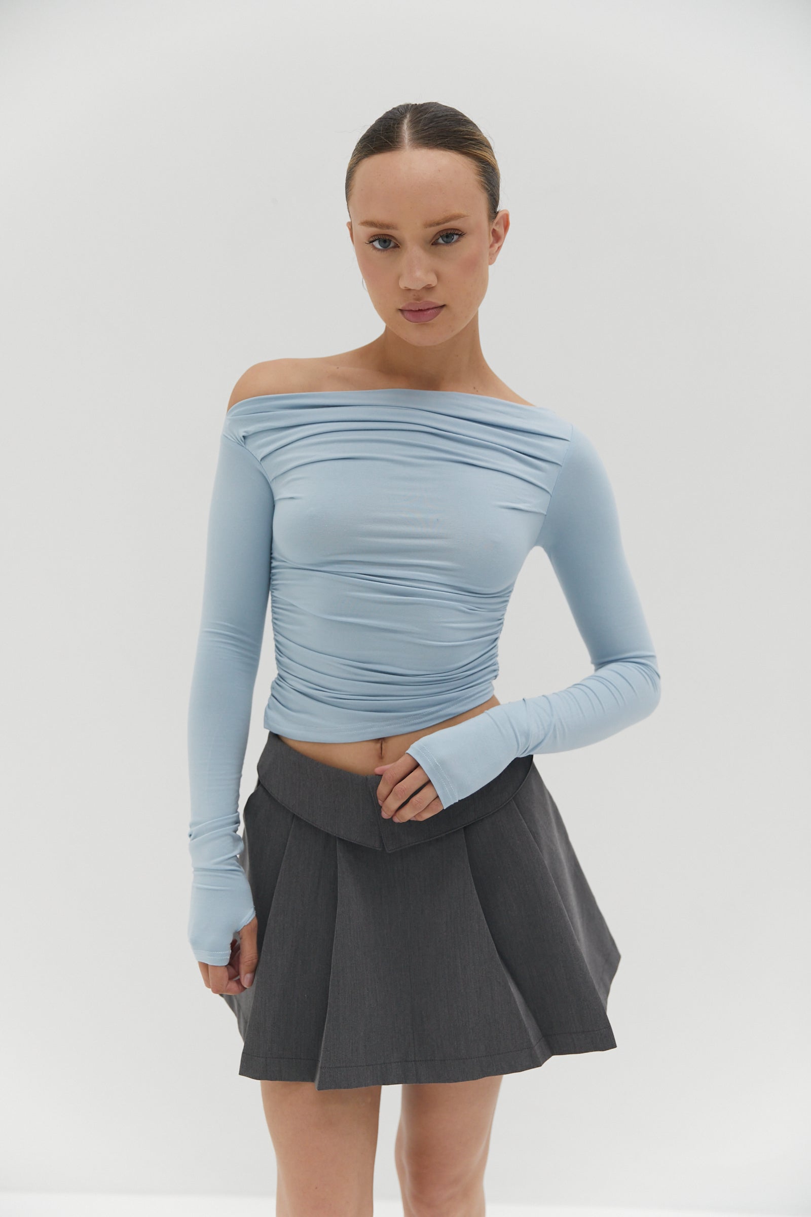 Featuring ruche side body detailing, the Bella Ruche off The Shoulder Top - Blue has a slightly cropped length