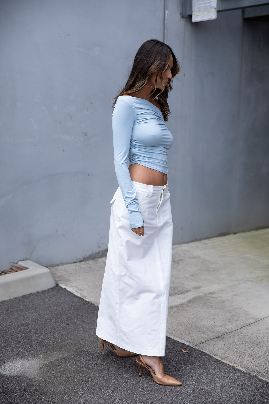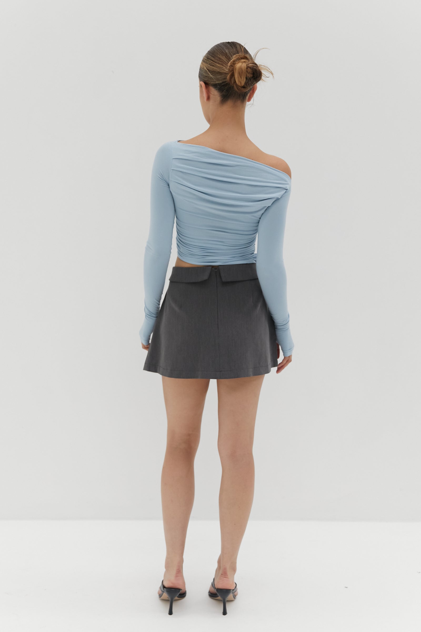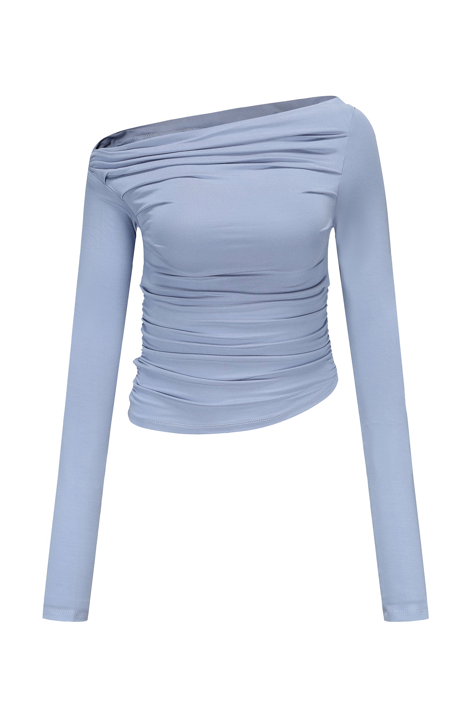 Featuring ruche side body detailing, the Bella Ruche off The Shoulder Top - Blue has a slightly cropped length