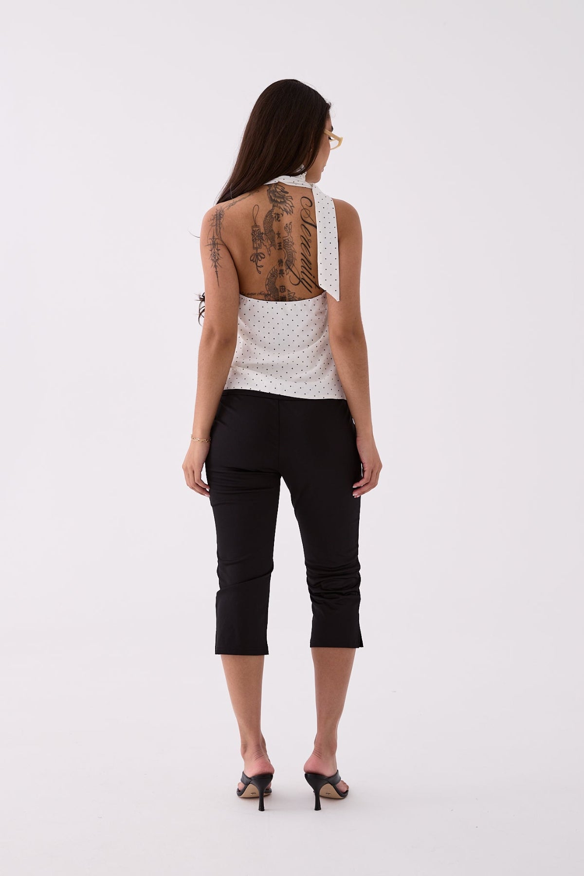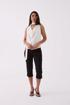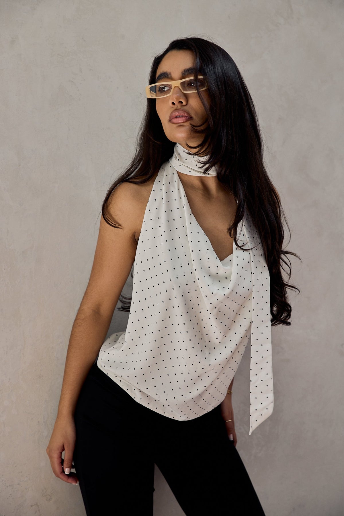 The Camilla Scarf Top features a soft draped neckline, halter-style cut, and a removable scarf tie for versatile styling. Designed in a lightweight crepe with a subtle spot print