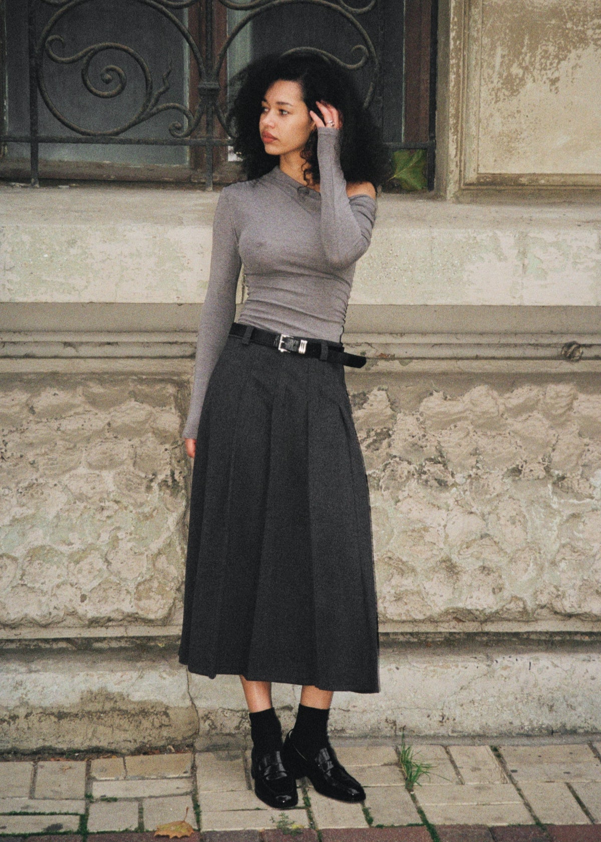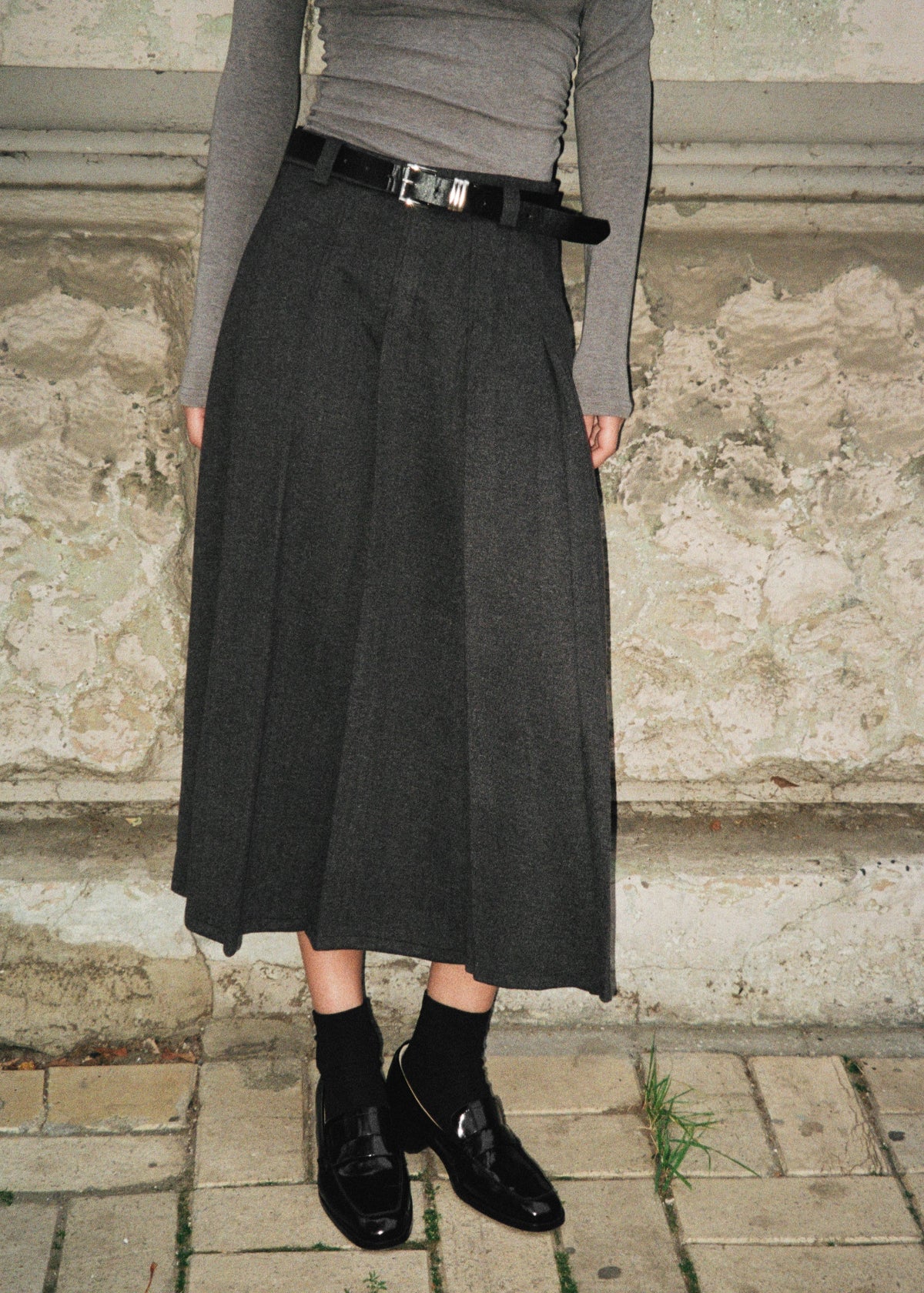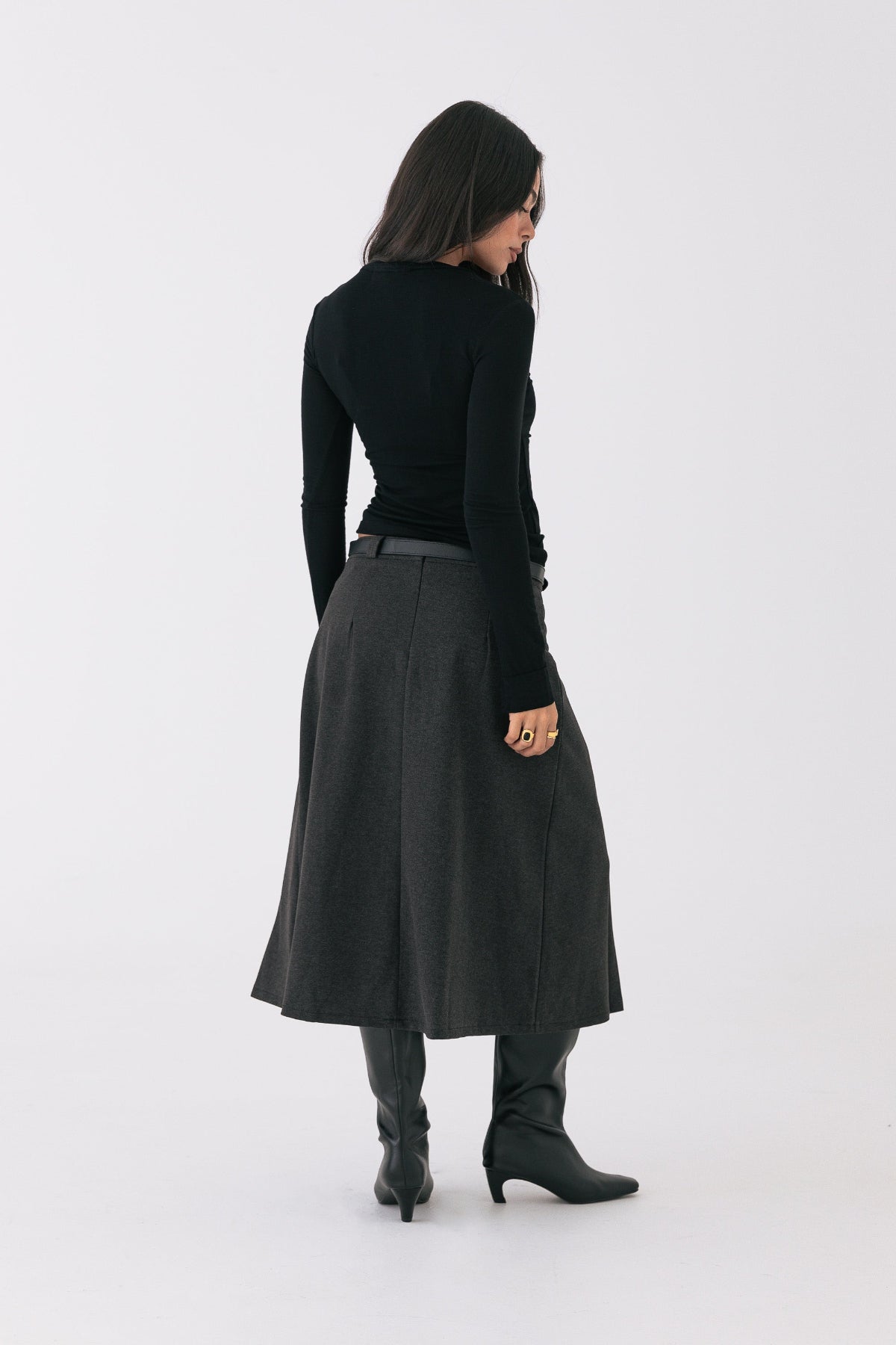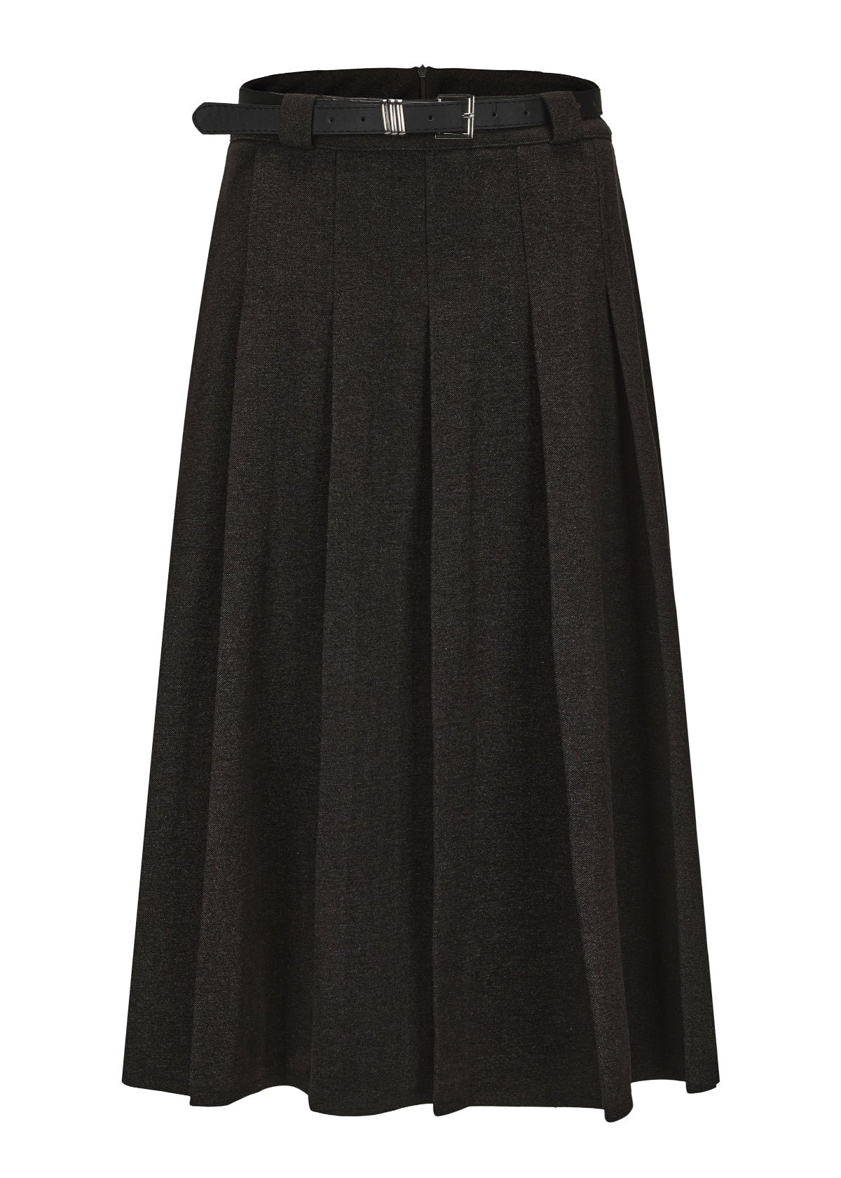 Minimal yet bold. This pleated midi skirt moves effortlessly, featuring sharp pleats, a structured A-line fit, and a sleek belt detail. Perfect with a fitted top and boots or a slouchy sweater. Classic, effortless, and always in rotation. Style with an oversized shirt or fitted tank—your call.