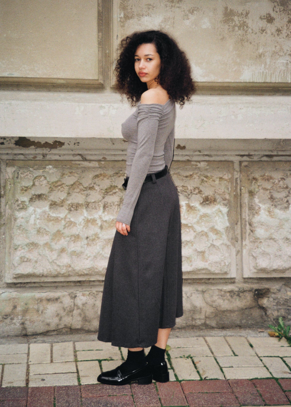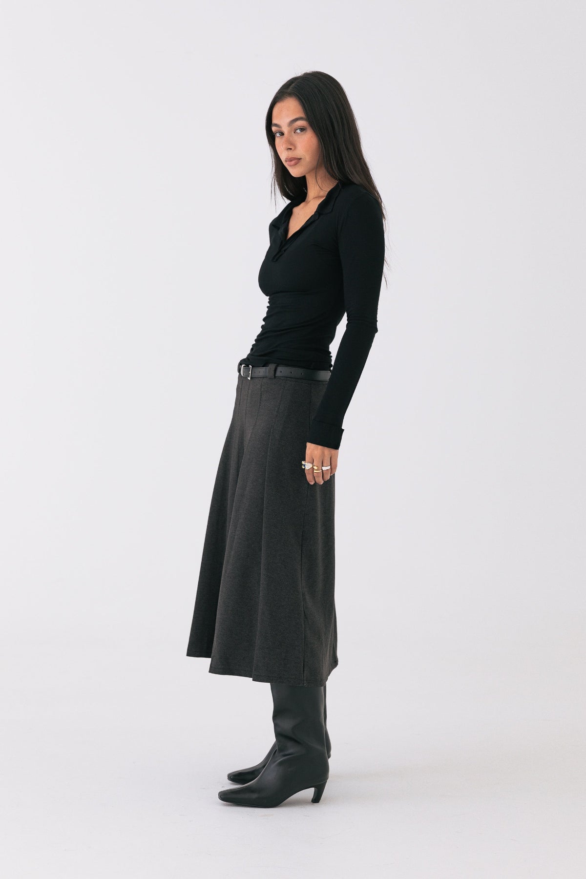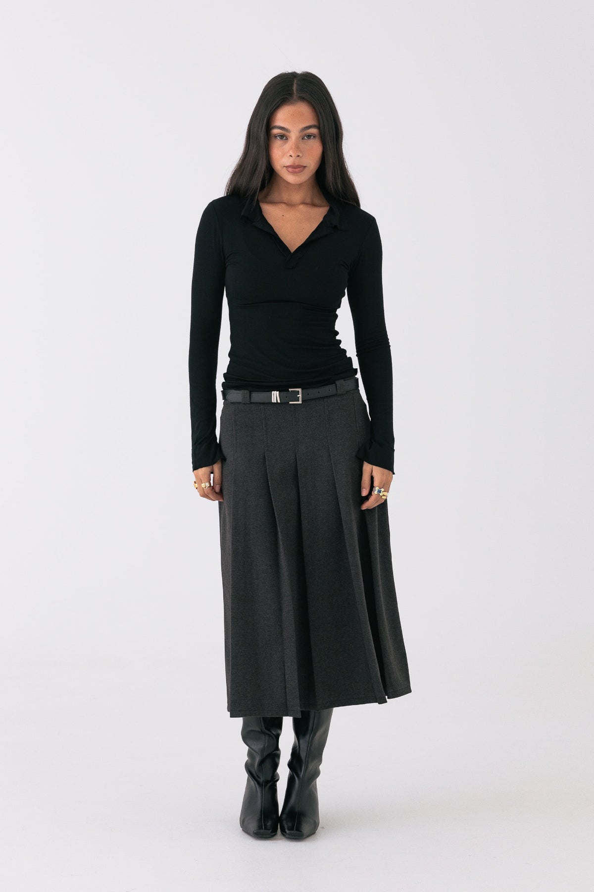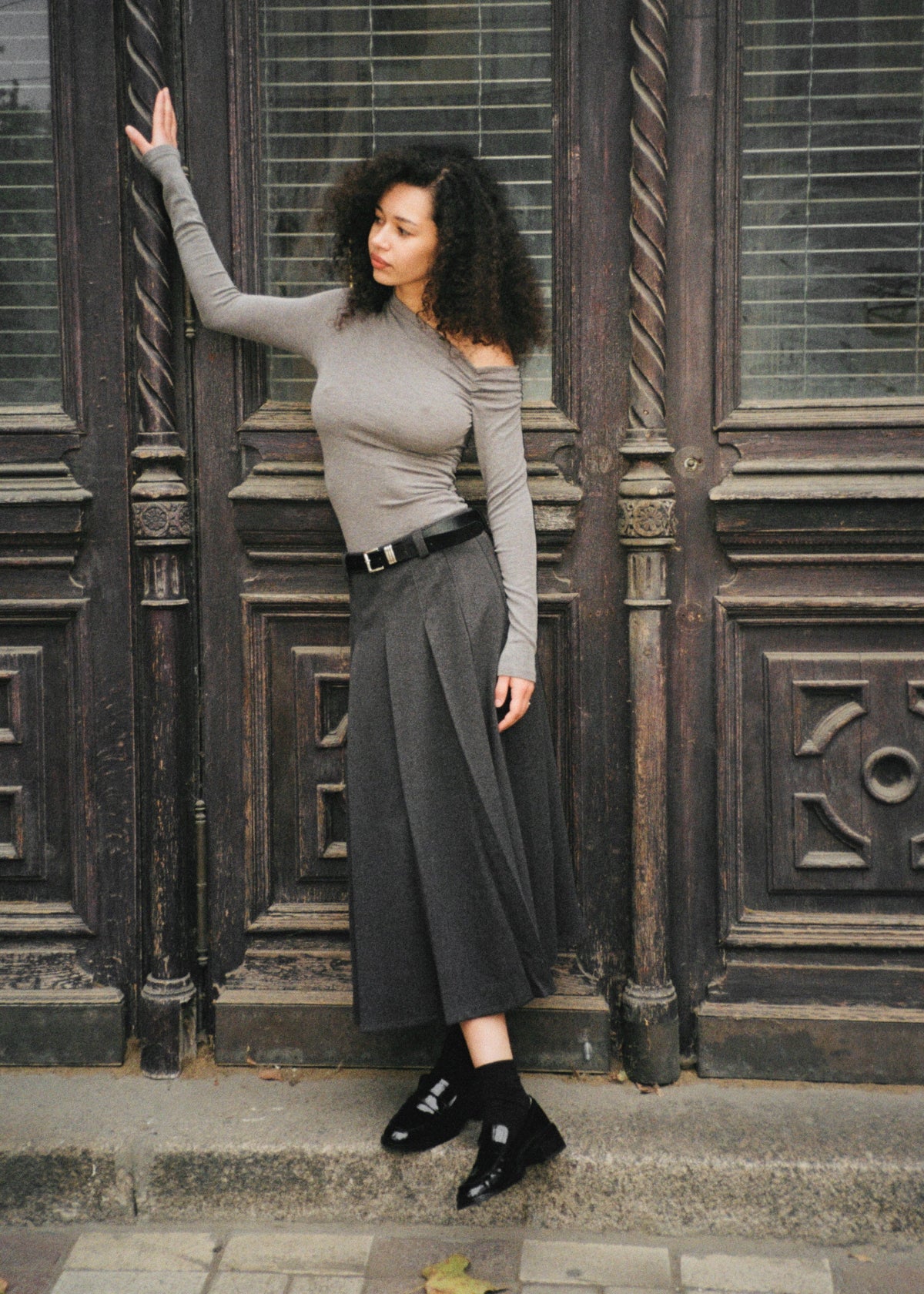 Minimal yet bold. This pleated midi skirt moves effortlessly, featuring sharp pleats, a structured A-line fit, and a sleek belt detail. Perfect with a fitted top and boots or a slouchy sweater. Classic, effortless, and always in rotation. Style with an oversized shirt or fitted tank—your call.