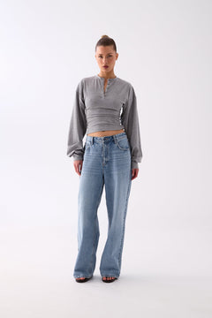 The Celeste Top features a soft, stretch rib fabrication designed to contour the body for a sleek, flattering fit. Finished with a deep V neckline and button placket.