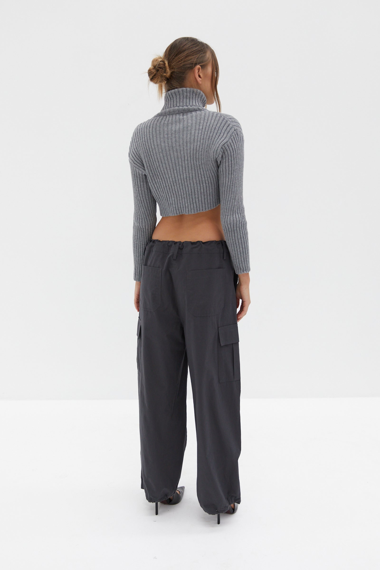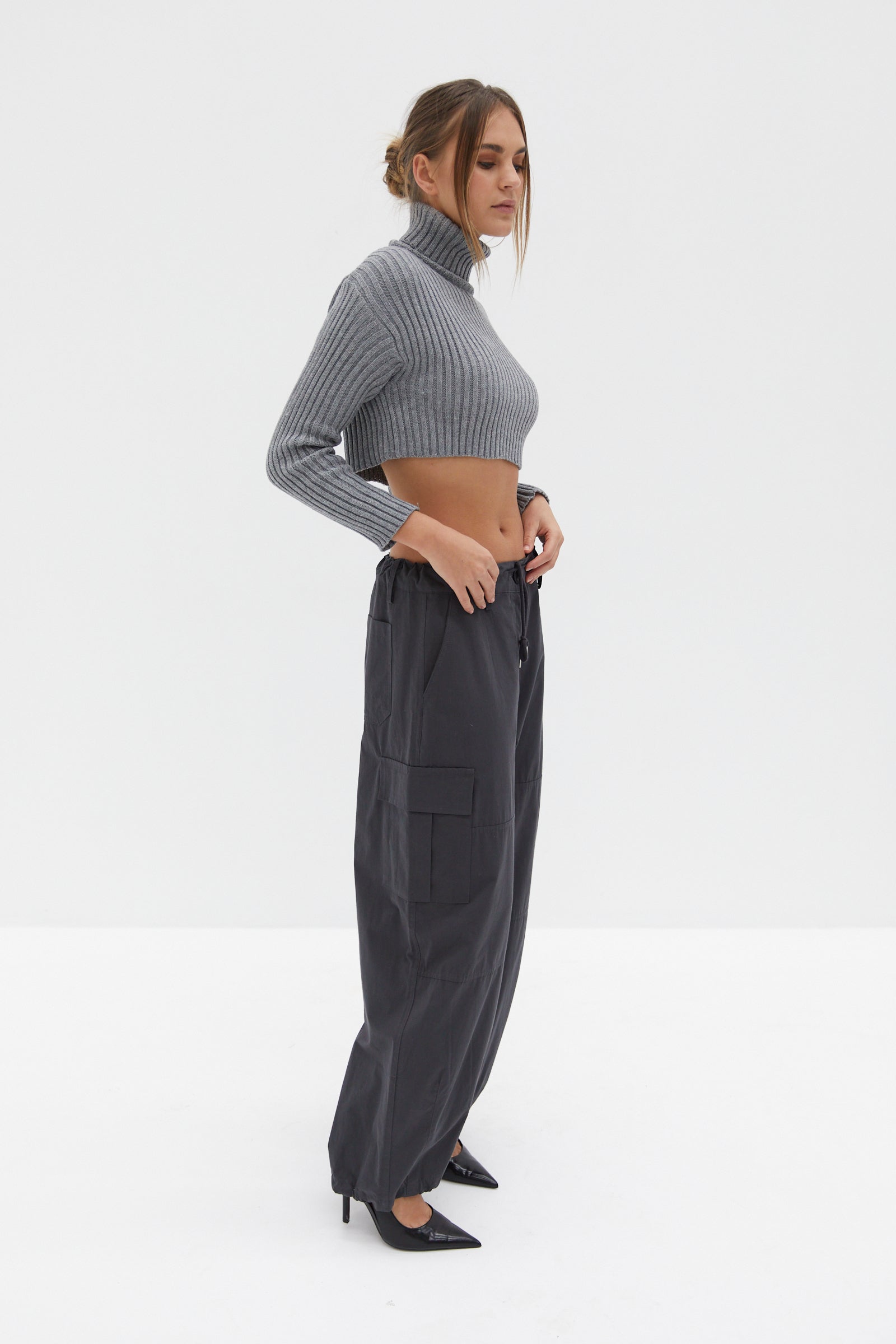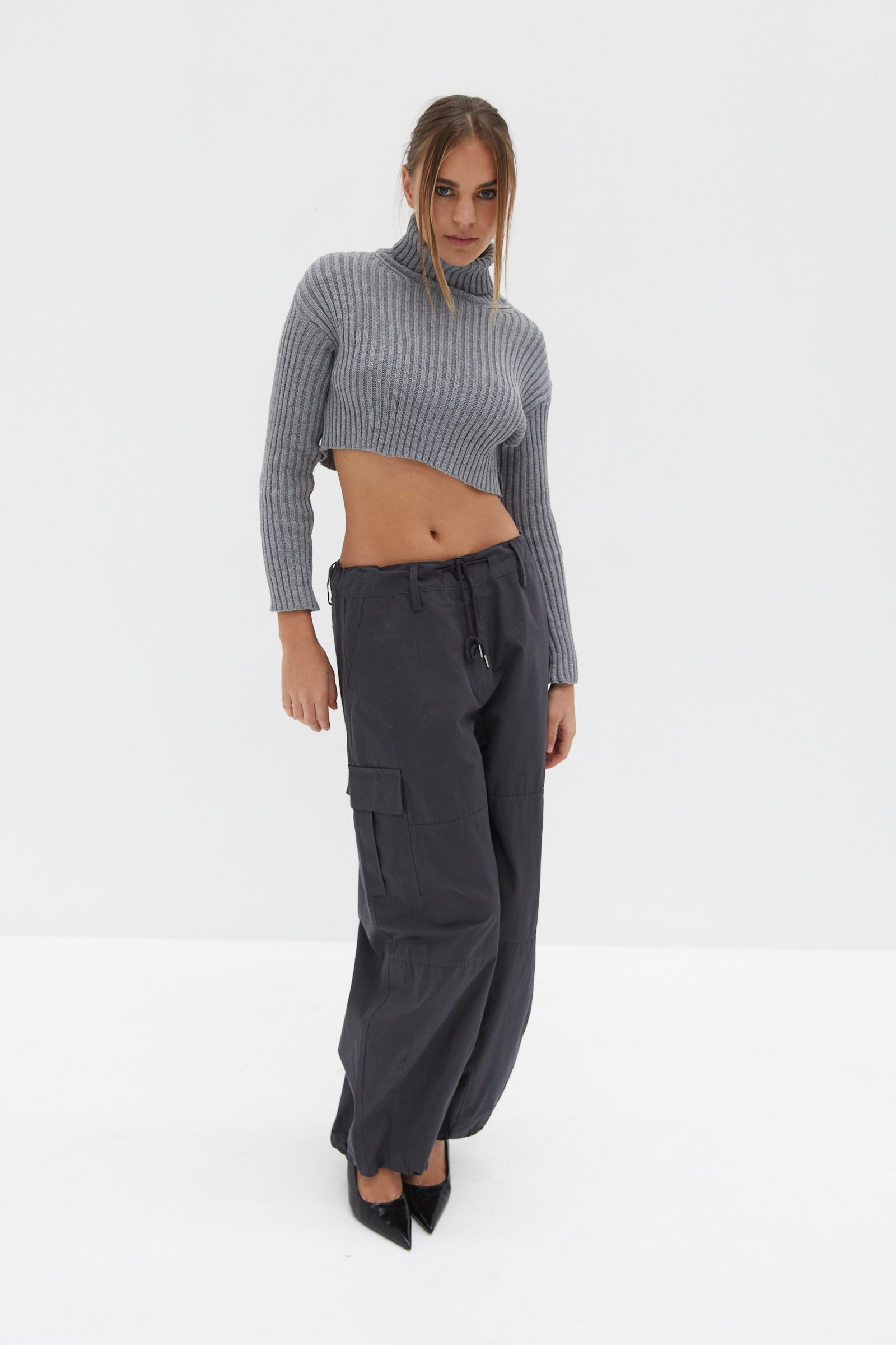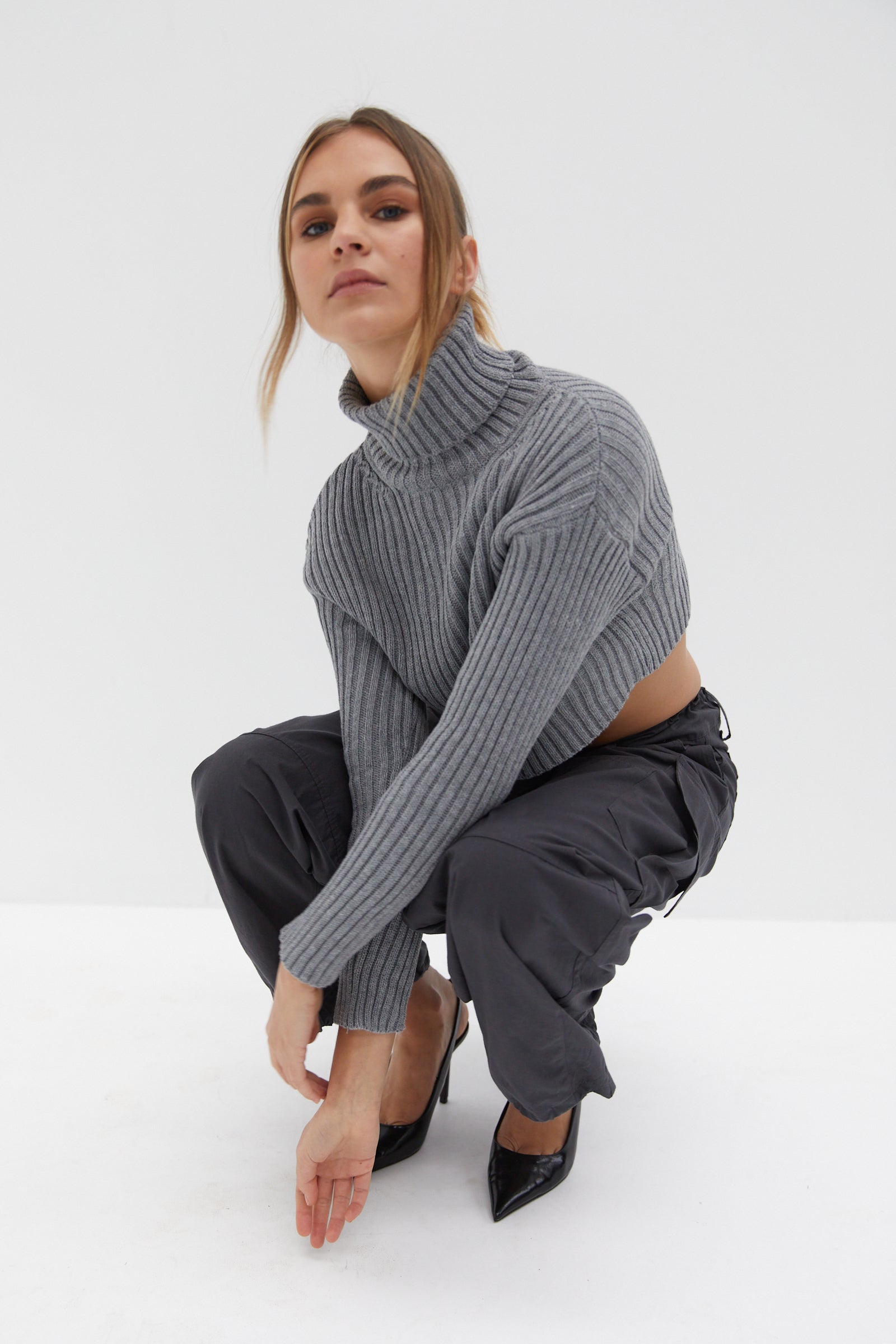 Boxy style sweater in a soft knit that features a high neck with a rolled edge and long sleeves