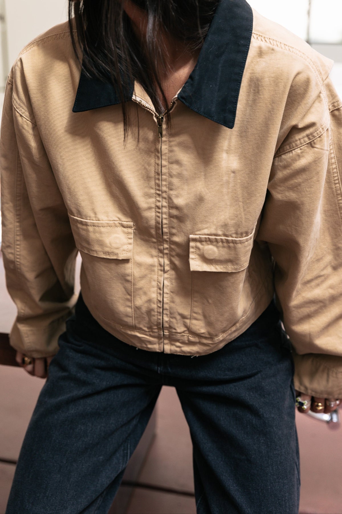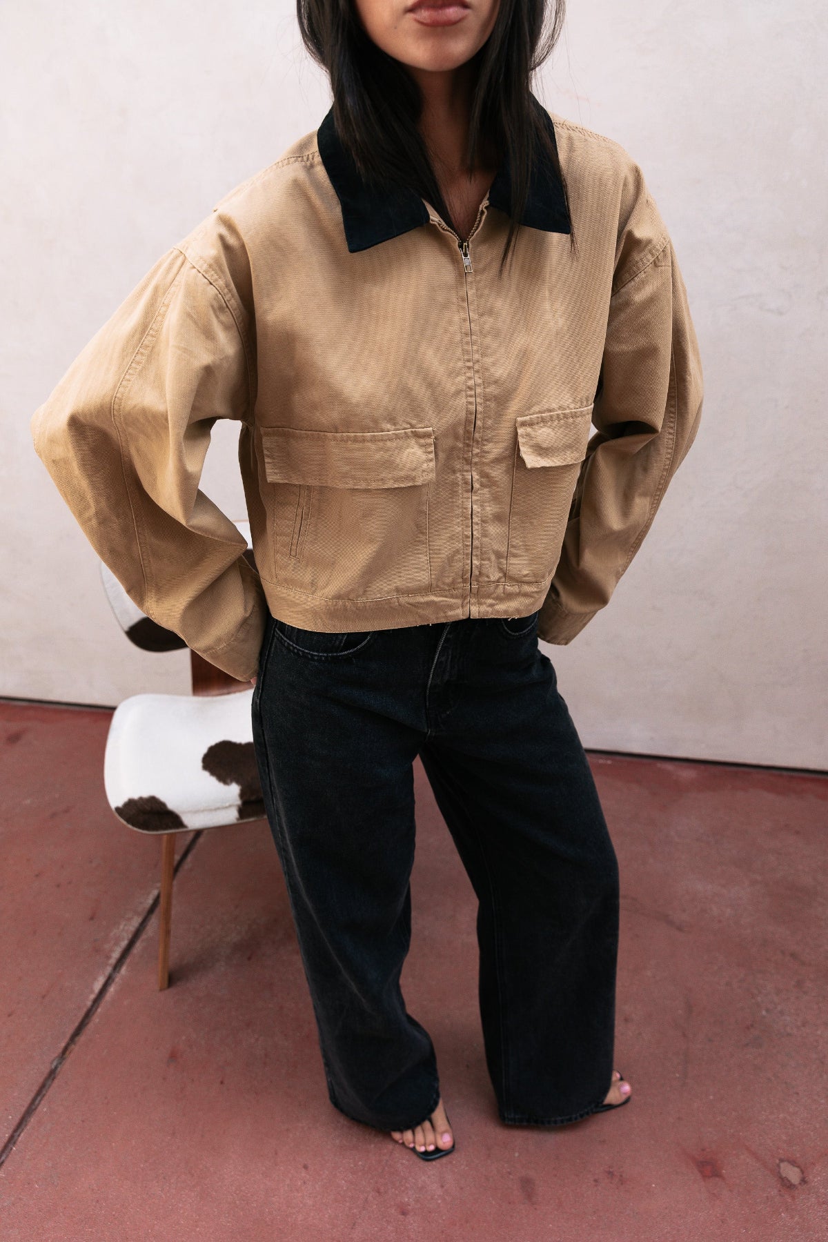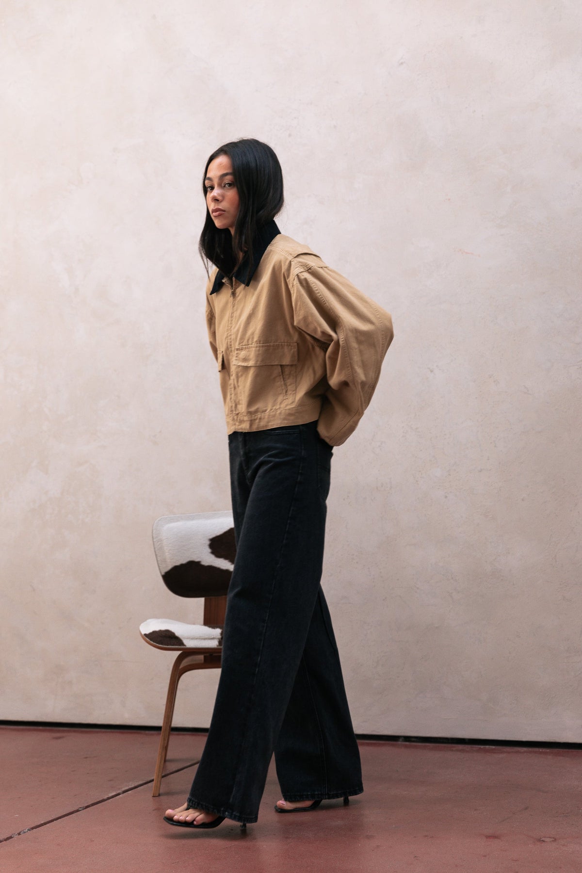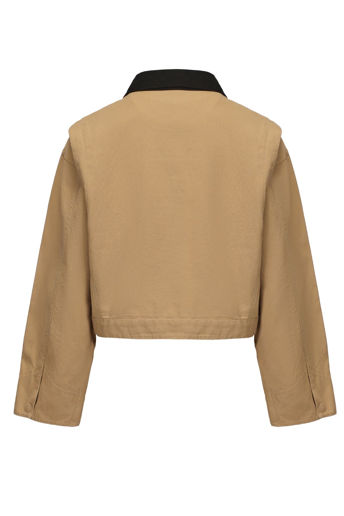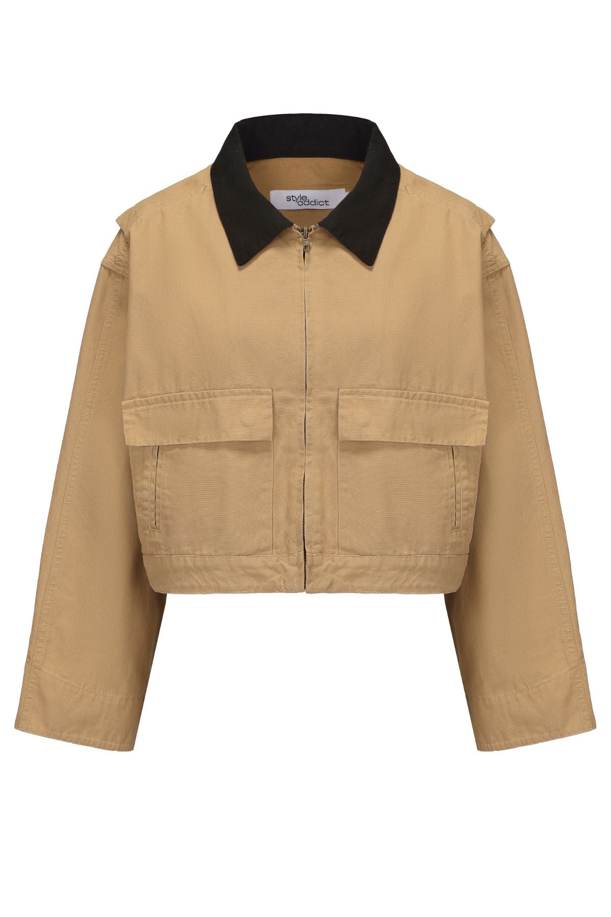 Your new off-duty layer. This cropped utility jacket features a boxy fit, oversized front pockets, and a contrast collar for subtle edge. Made from structured cotton for that clean, effortless look.