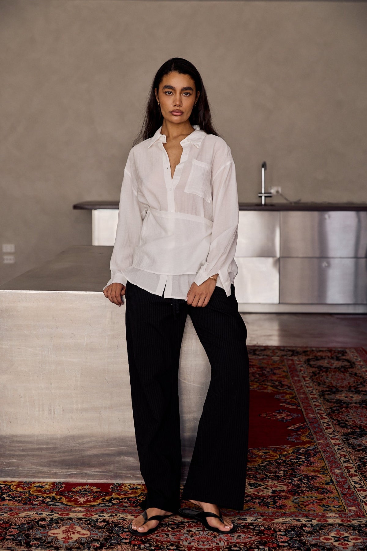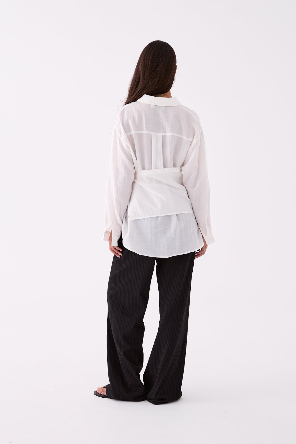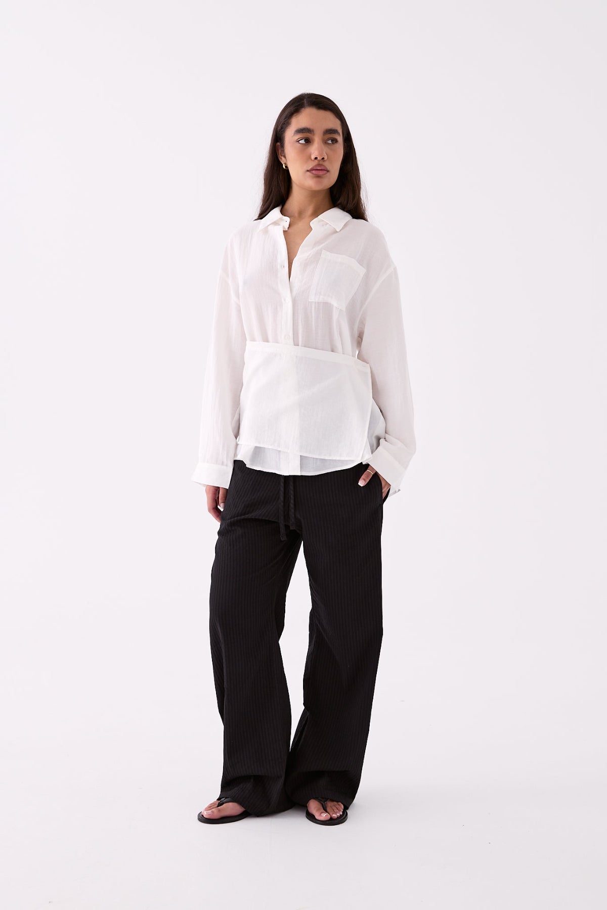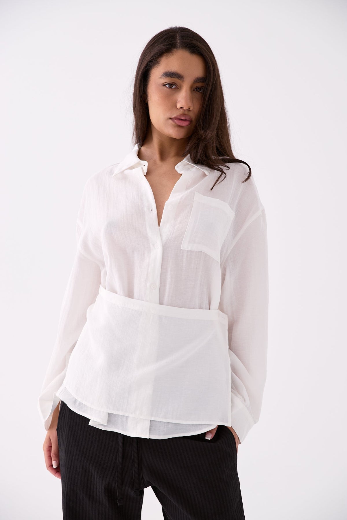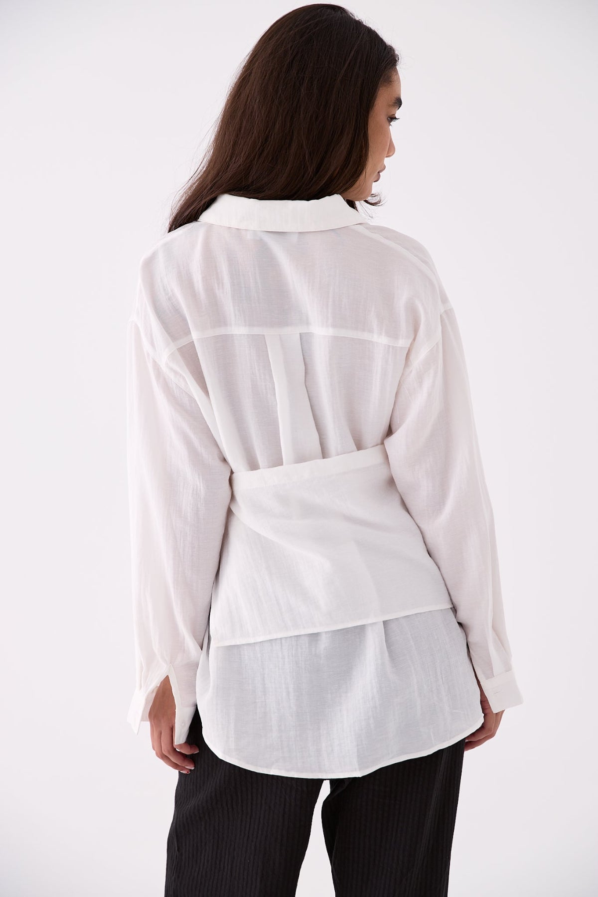 An elevated essential with a modern twist. The Elara Linen Shirt is crafted from a soft, breathable linen blend and features a detachable wrap skirt layer that allows for versatile styling. Wear it layered and cinched at the waist for structure, or without for a relaxed, timeless look.