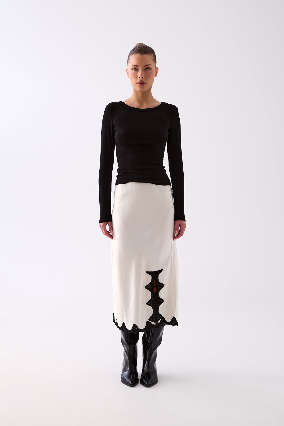 Made from a soft stretch knit, it features a clean front and a deep scoop-back silhouette with a fine adjustable strap detail. Designed to pair effortlessly with slip skirts, denim, and tailored layers.