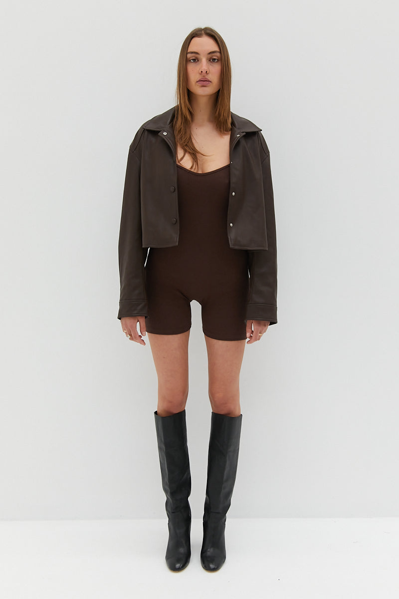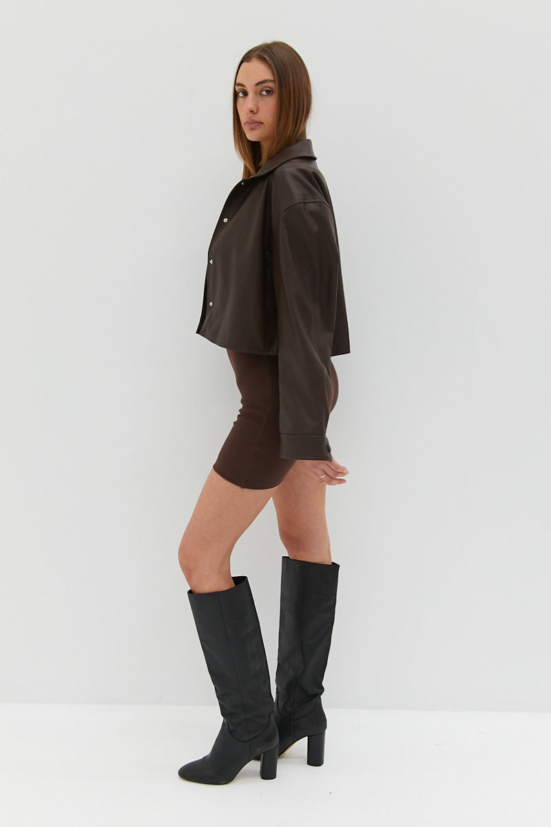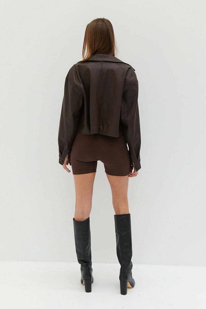 Super soft chocolate faux leather jacket cut to be worn loose featuring boxy fit, slightly cropped length and covered press buttons