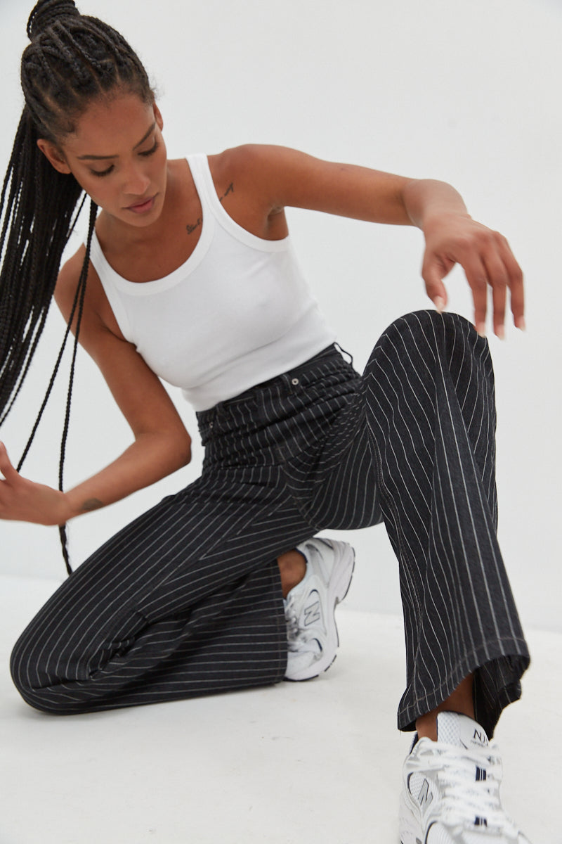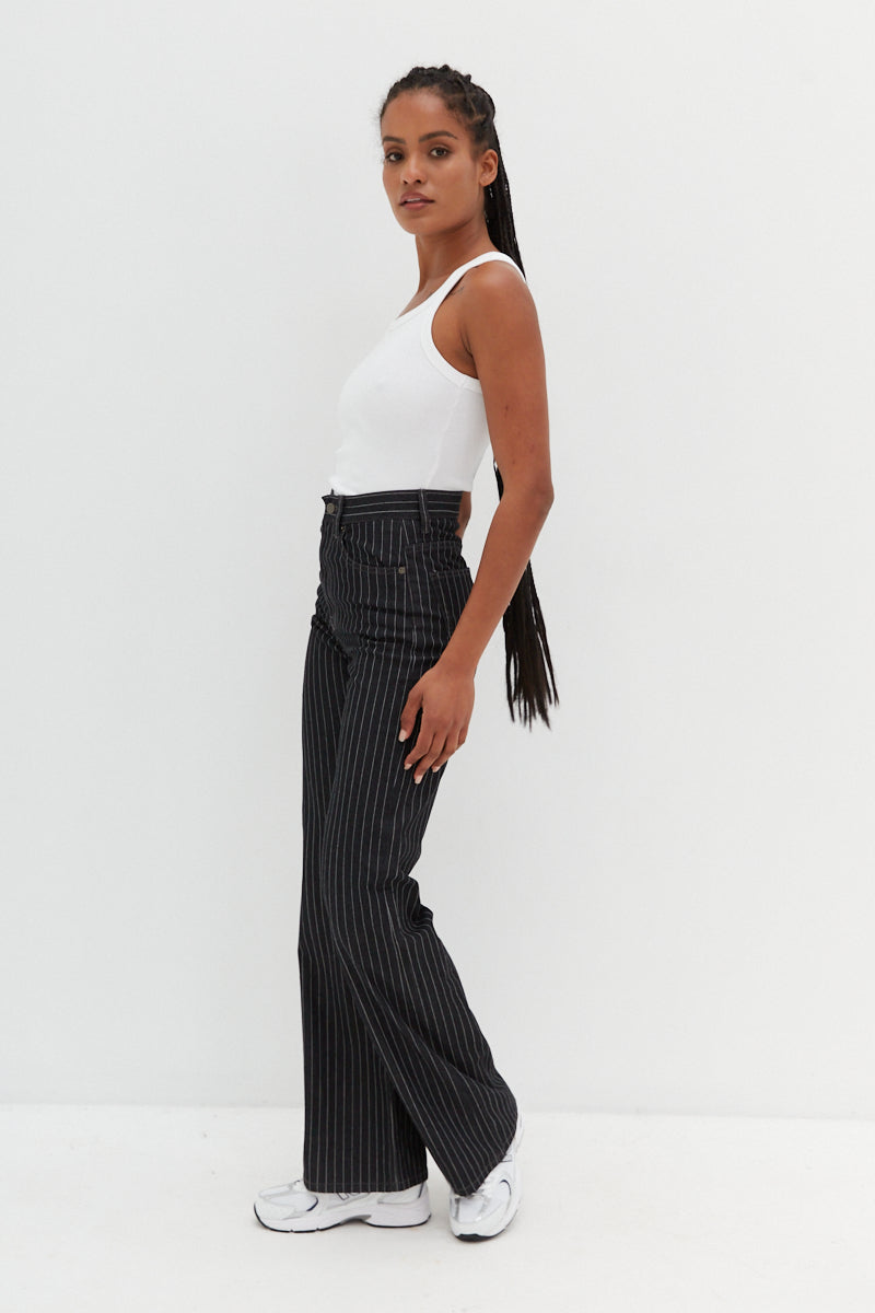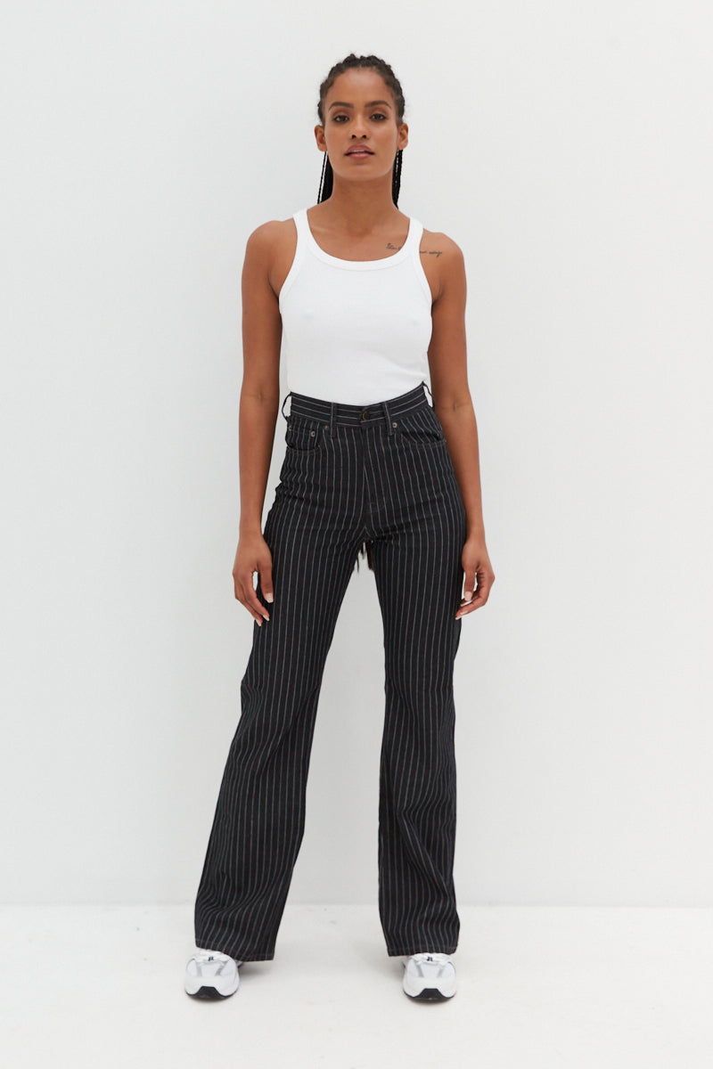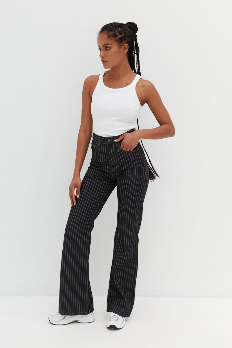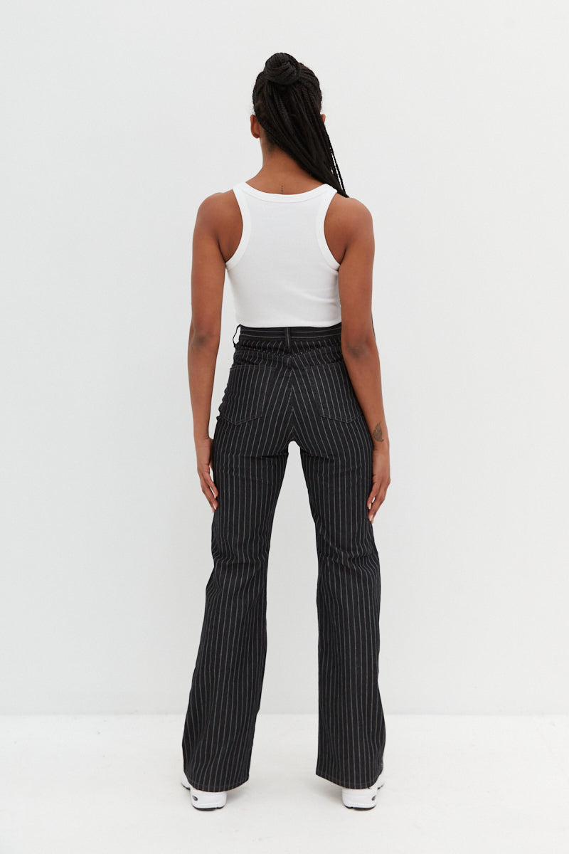 A classic flare leg jean featuring flattering high waist and black pinstripe material. Worn here with the Lou Tank
