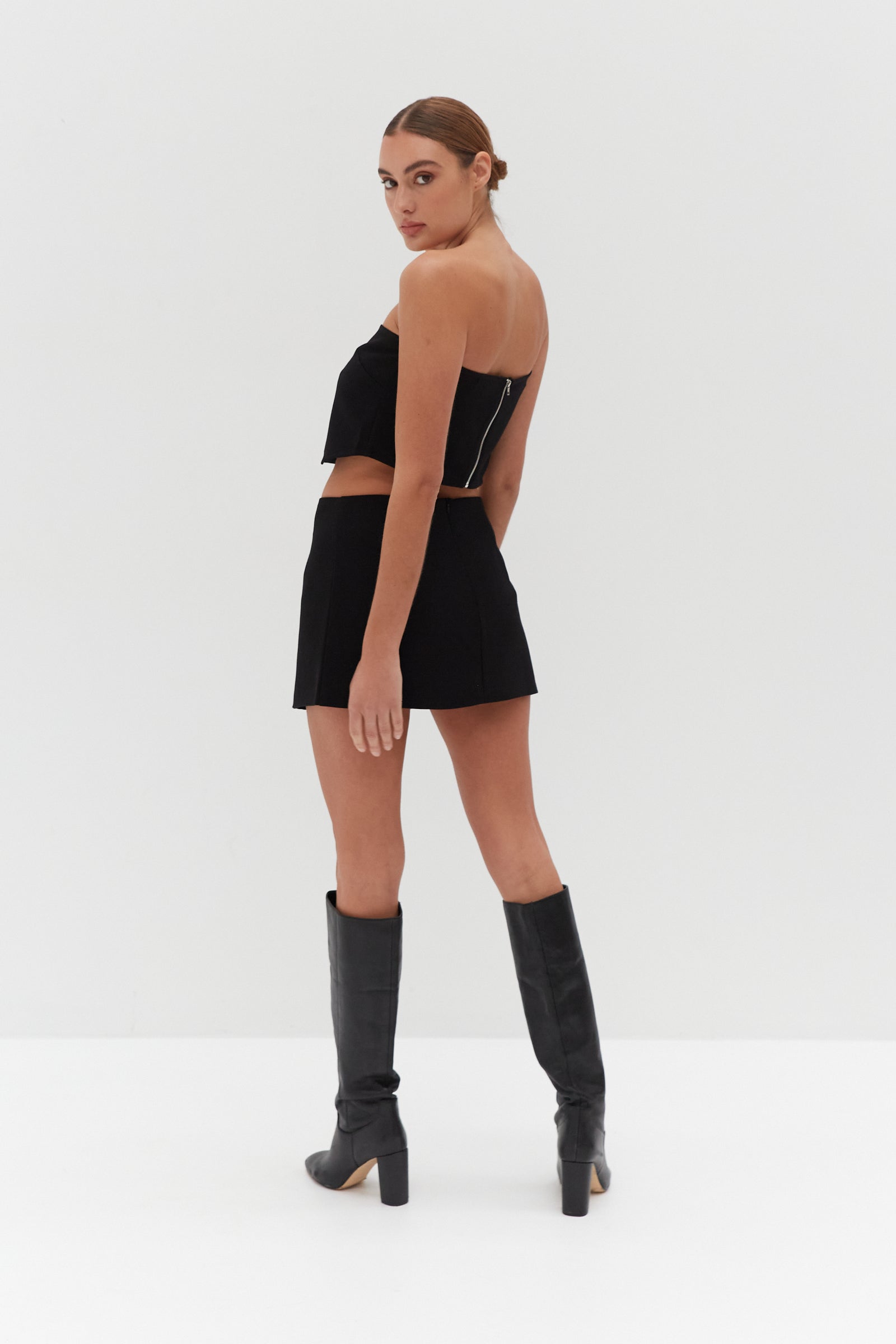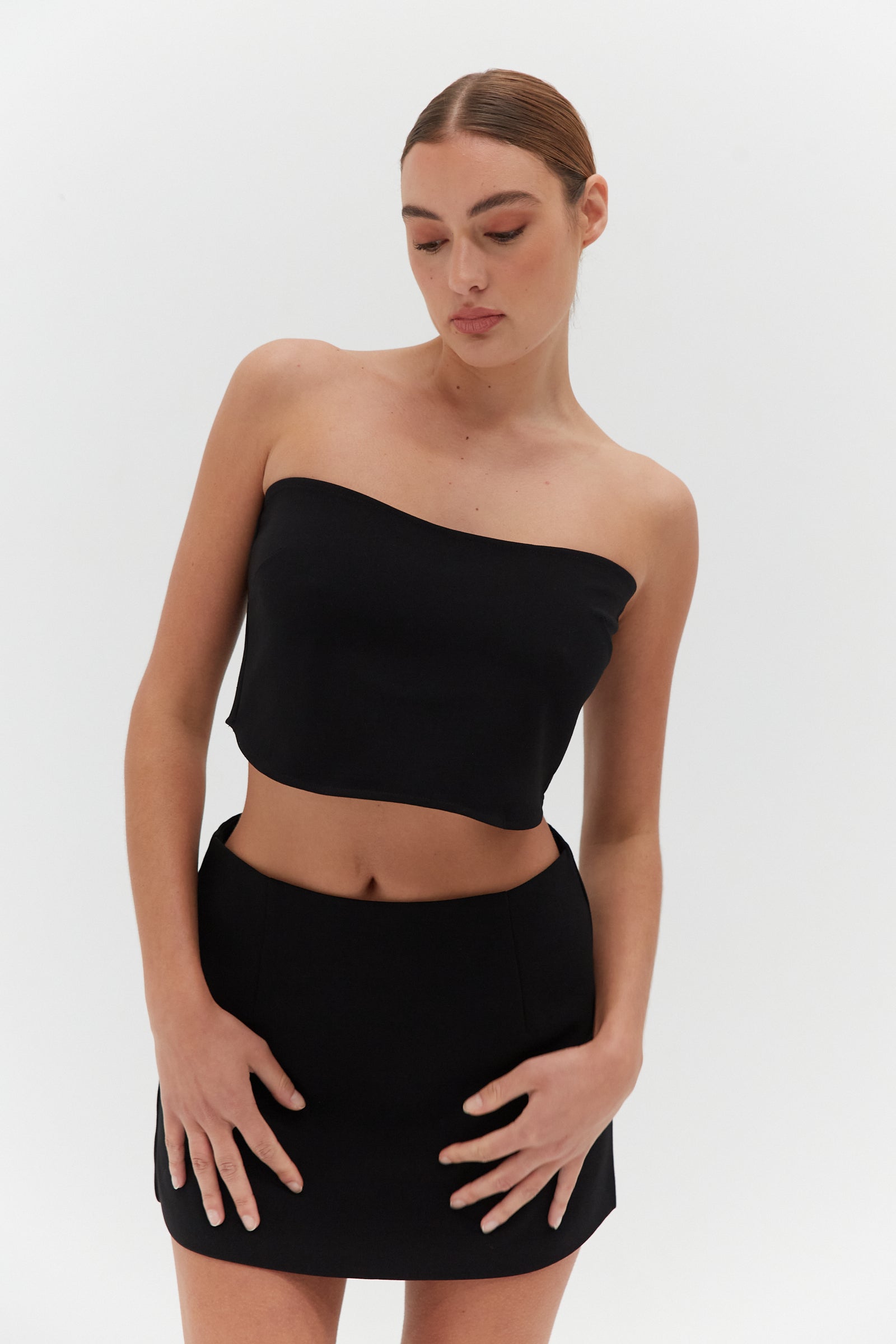 Sweet heart top featuring cropped length, curved hem, exposed back zipper and dart detail