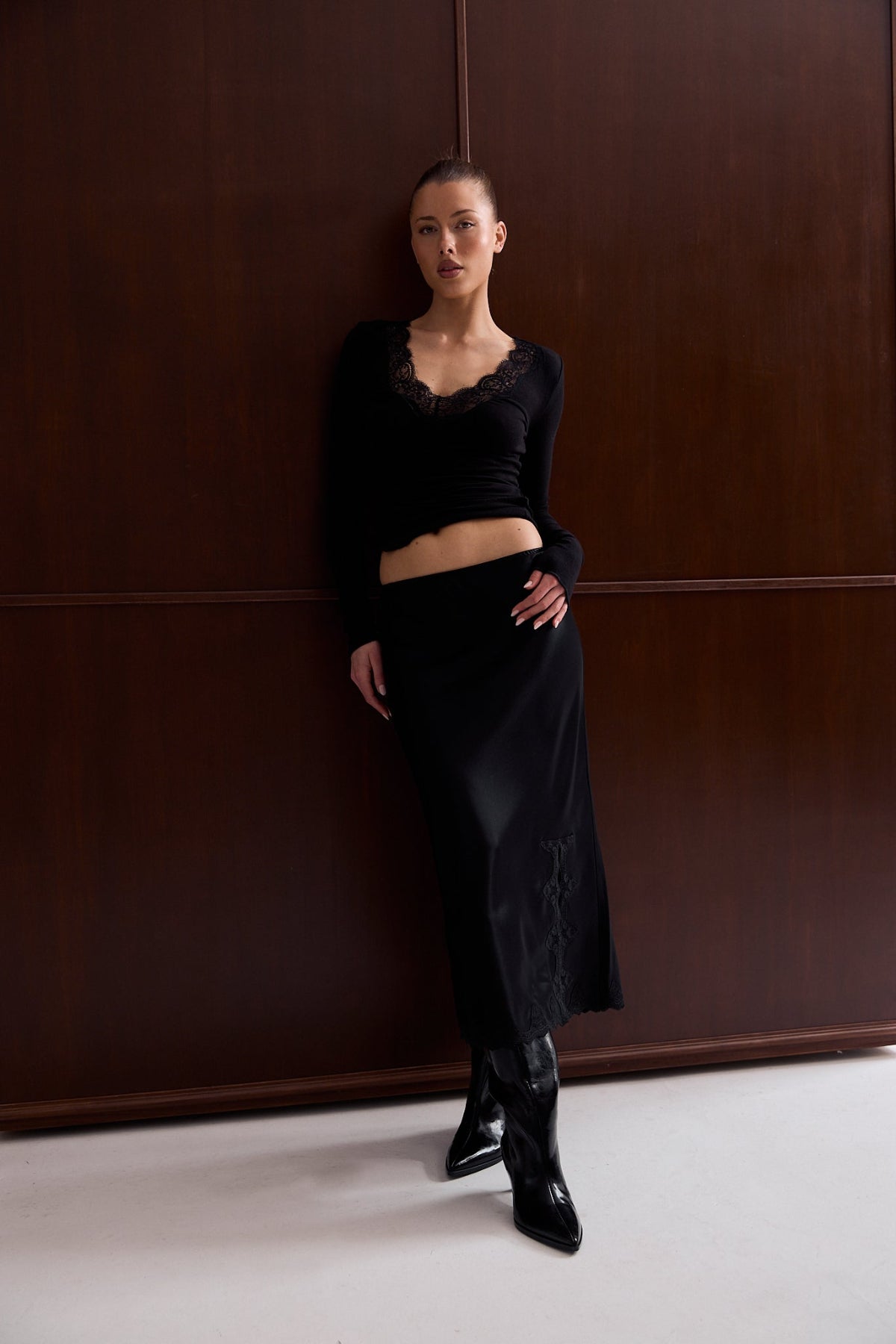 The Lia Lace Trim Long Sleeve Top is crafted from a soft, body-skimming knit and framed with a delicate scalloped lace neckline that adds subtle femininity to an otherwise minimal silhouette. Designed to dress up or pare back, it layers seamlessly with slip skirts, tailored trousers, or denim.