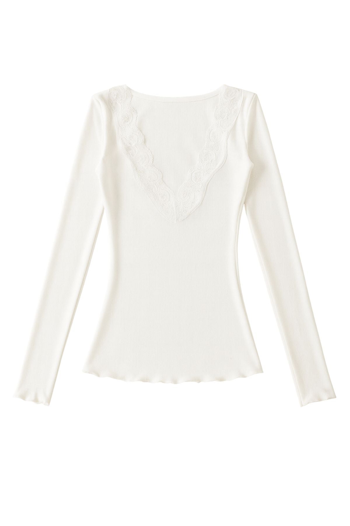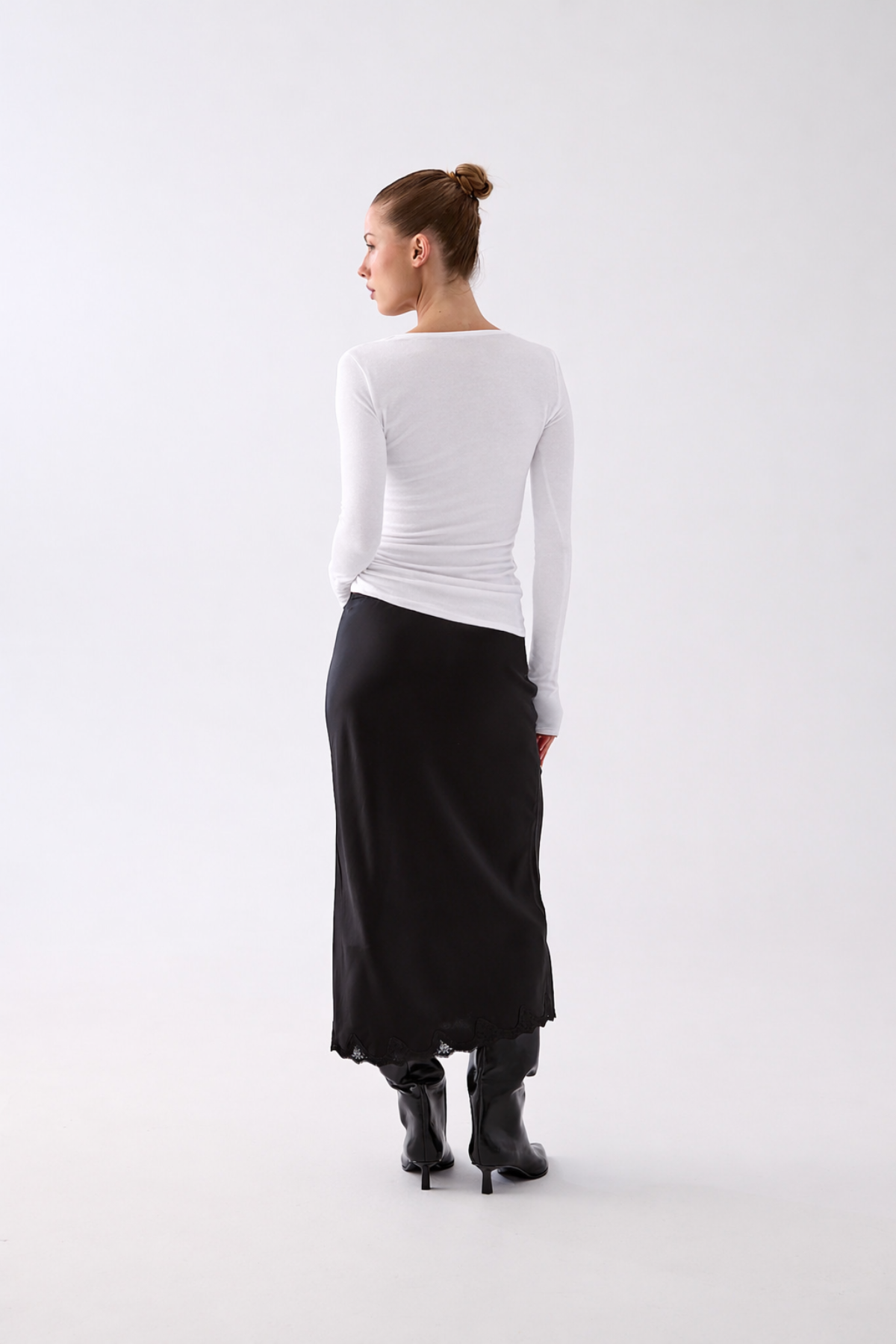 The Lia Lace Trim Long Sleeve Top is crafted from a soft, body-skimming knit and framed with a delicate scalloped lace neckline that adds subtle femininity to an otherwise minimal silhouette. Designed to dress up or pare back, it layers seamlessly with slip skirts, tailored trousers, or denim.