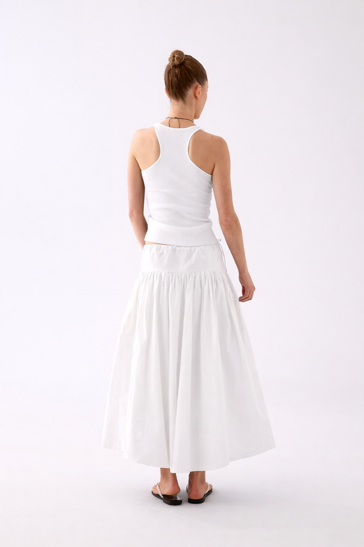 Our Lily Skirt - White is made from soft cotton, this skirt features an elastic waistband with an adjustable tie for a comfortable and customizable fit. Its full length and waist panel detail add a touch of detail, making it perfect for any occasion. Wear it high or low on the waist; versatility at its finest.