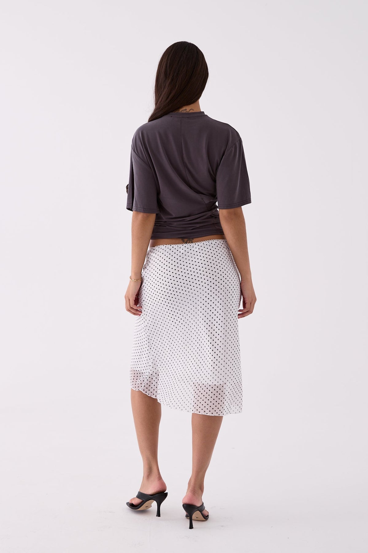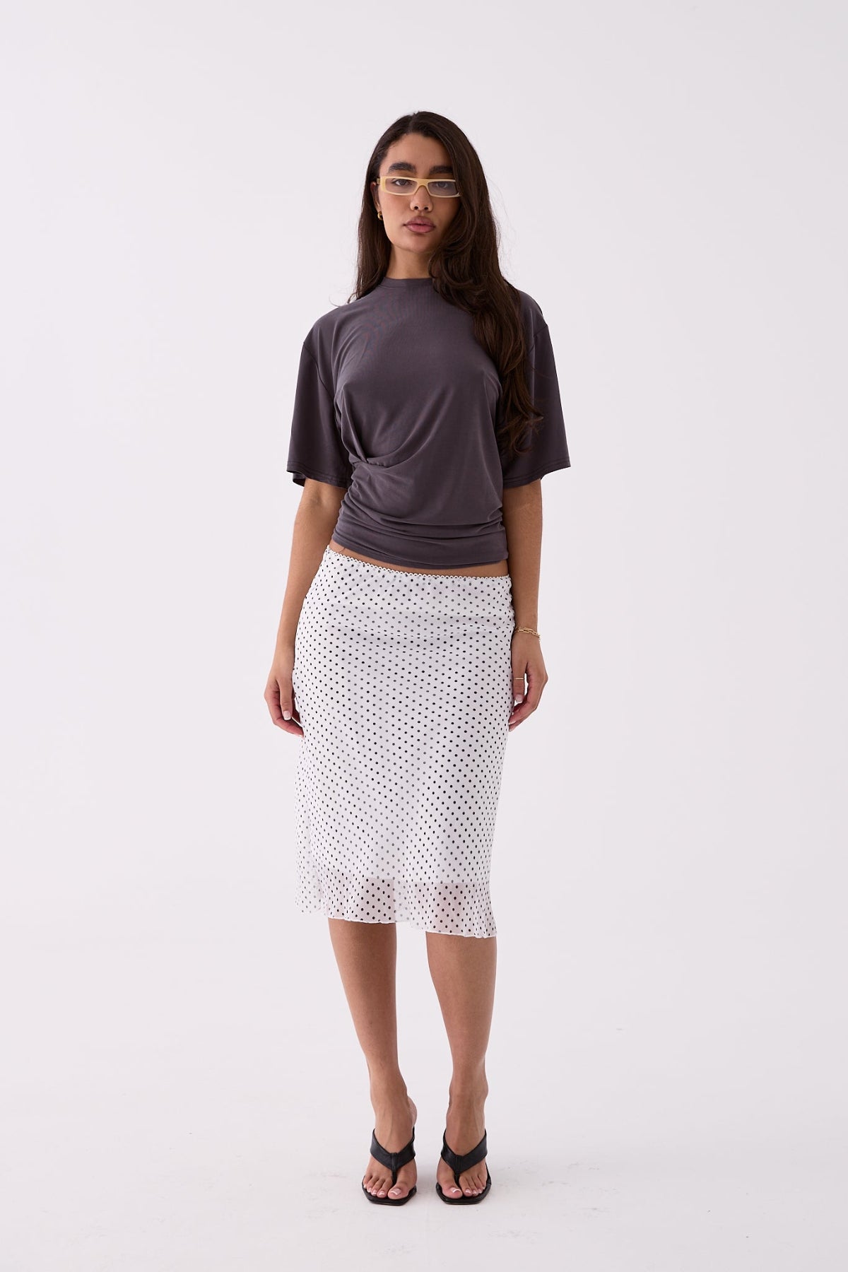 An understated essential with soft structure. The Lira Top features a high neckline, relaxed drape through the body, and subtle gathered detailing at the waist for a flattering finish. Crafted from a smooth stretch fabrication, the perfect base for day-to-night styling.