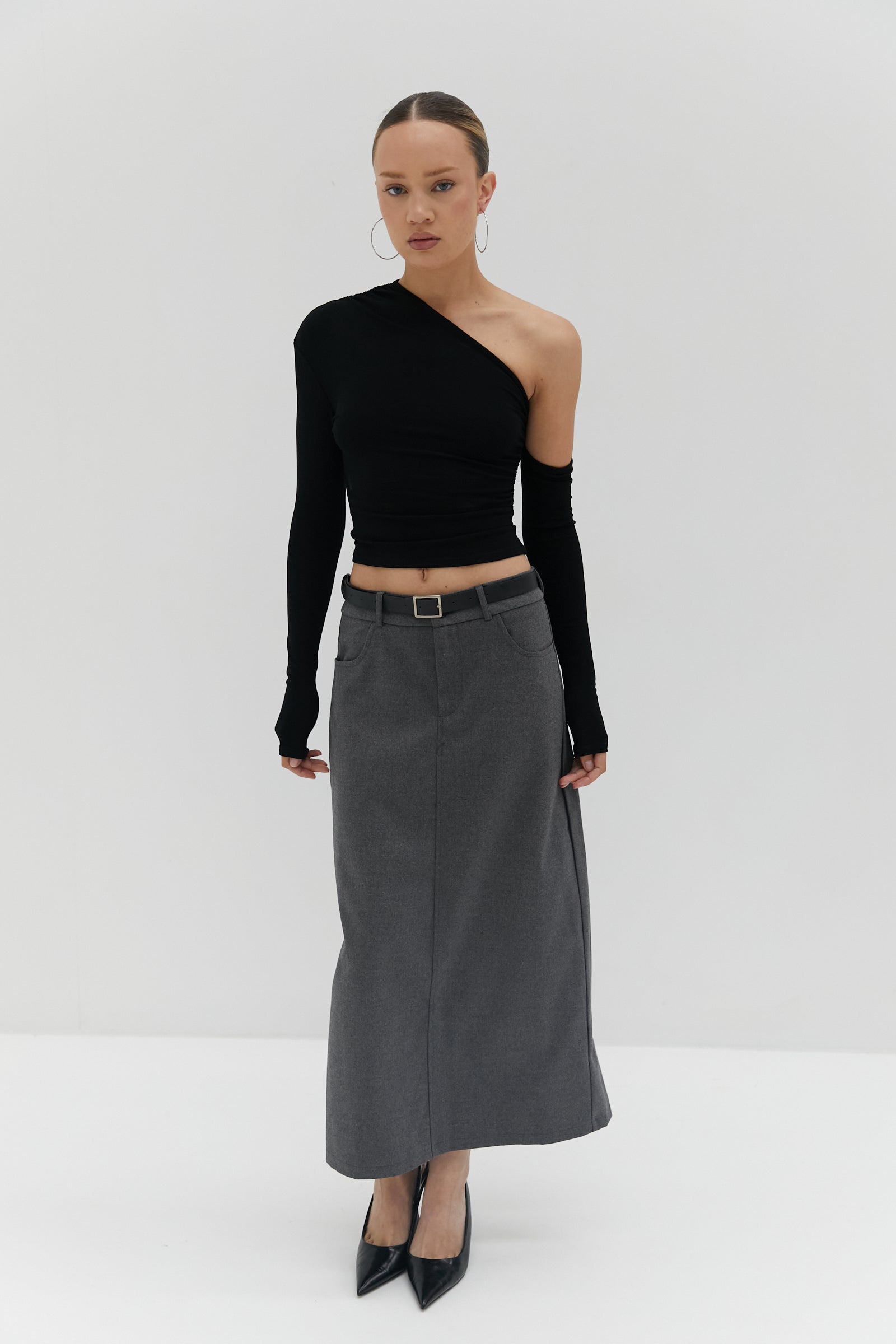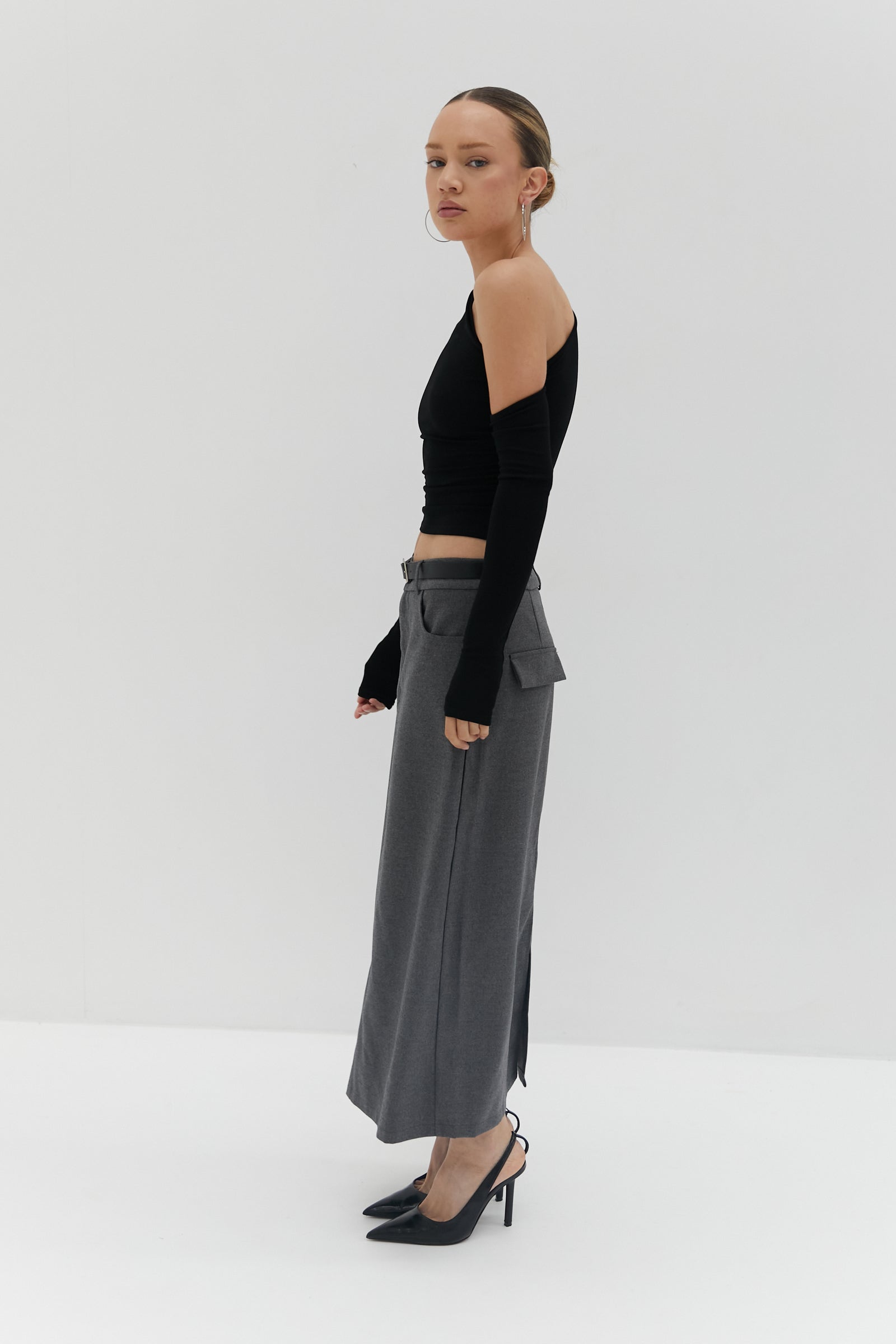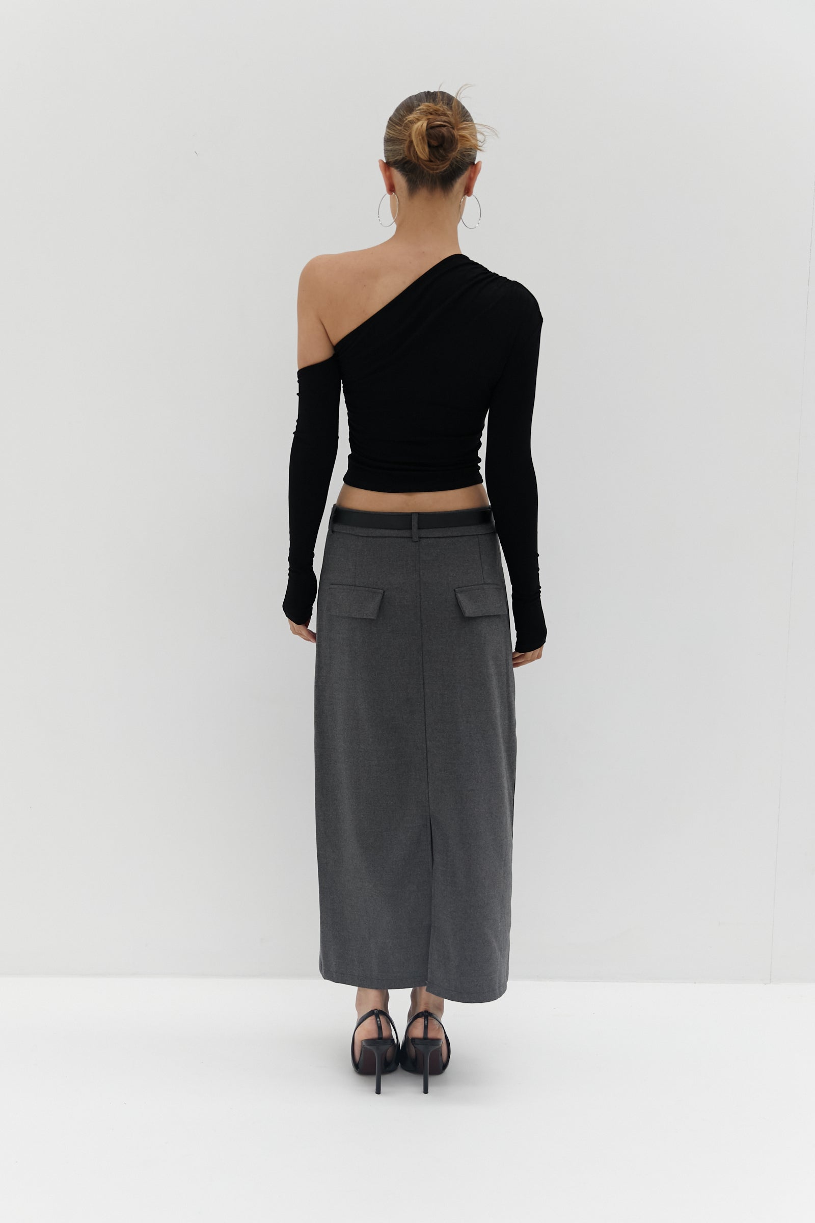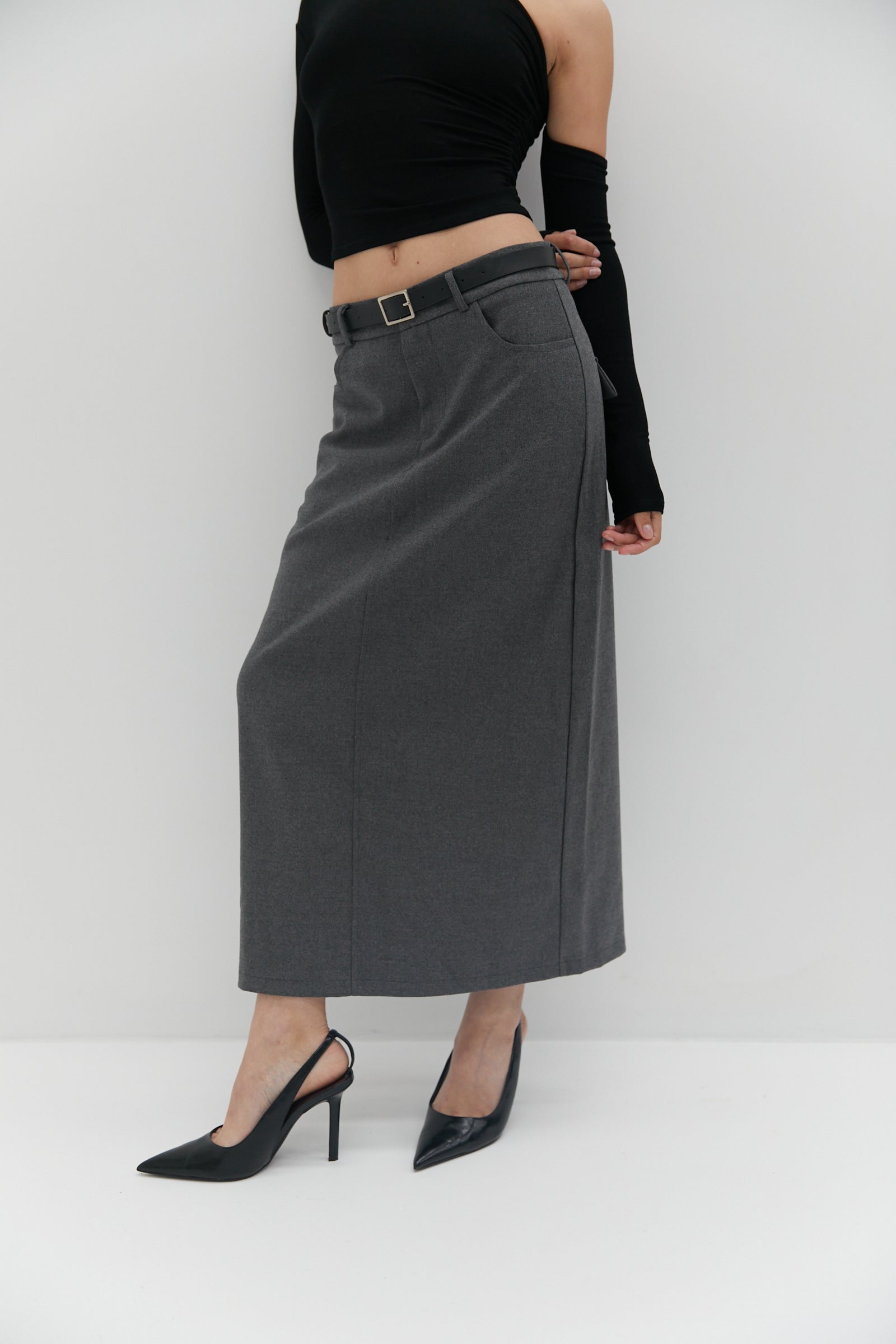 The Mia Belt Skirt - Grey combines modern sophistication with a timeless silhouette. Crafted from suiting fabric, this pencil skirt features faux back pockets and a back slit, while a minimal black belt is included