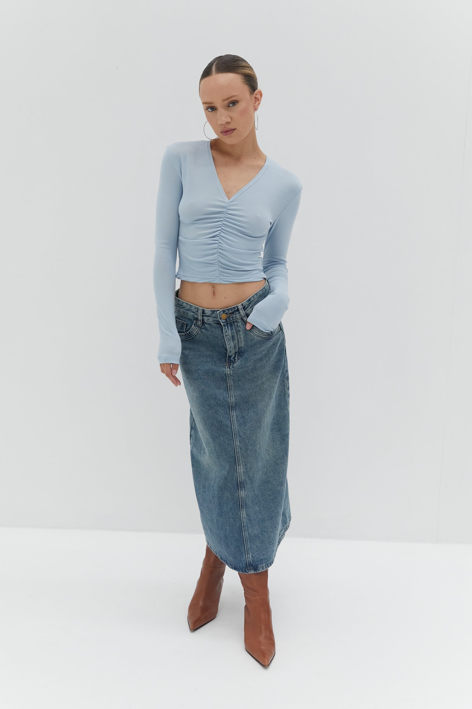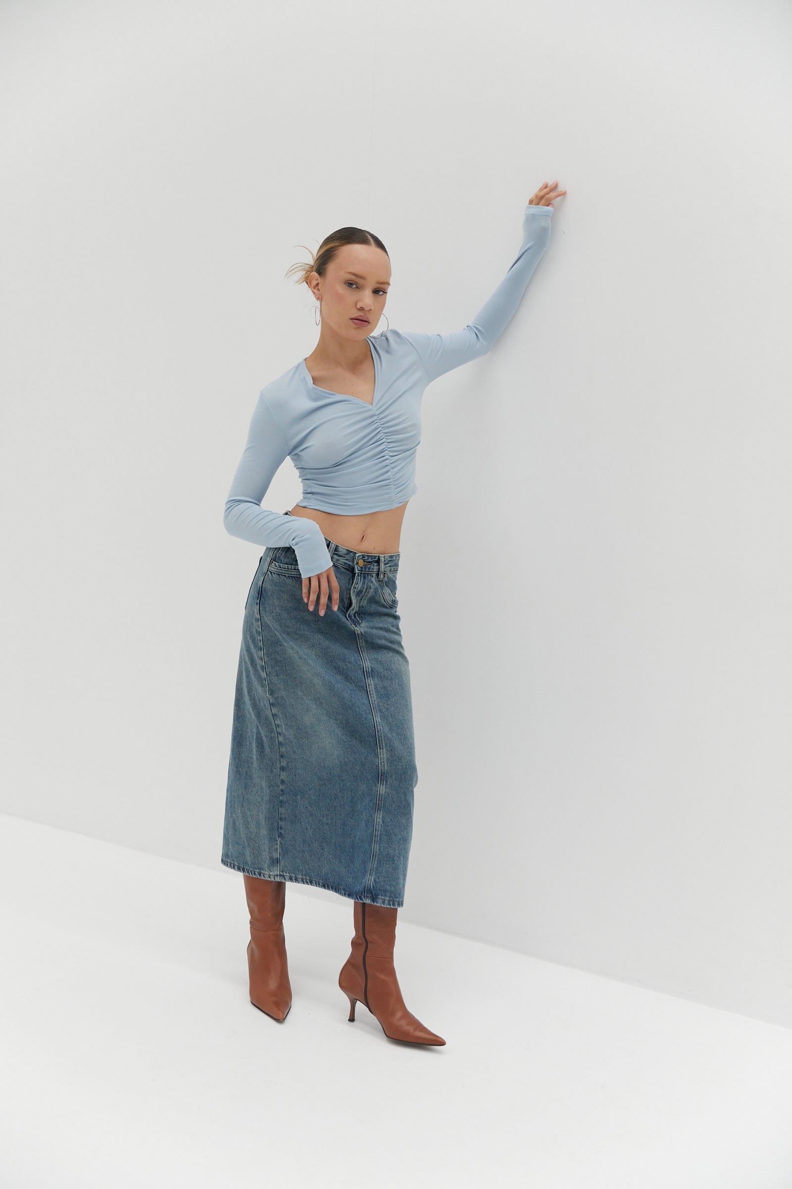 This Nicole Denim Midi Skirt is an effortless denim midi skirt design with a vintage-inspired look, back slit and functional side and back pockets.