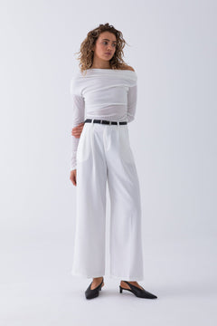 The Noah Trouser is a relaxed tailored pant designed to sit at the waist with a sleek belt detail. Made from a lightweight, drapey fabric in classic white. Style them with crisp shirting or a fitted knit for an effortless, polished look.