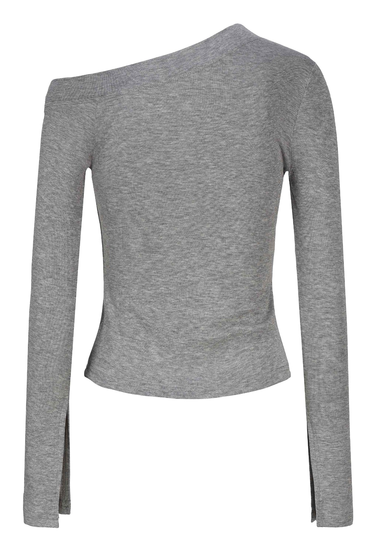 With an asymmetrical neckline, long sleeves and featuring a slit detail at the cuffs.