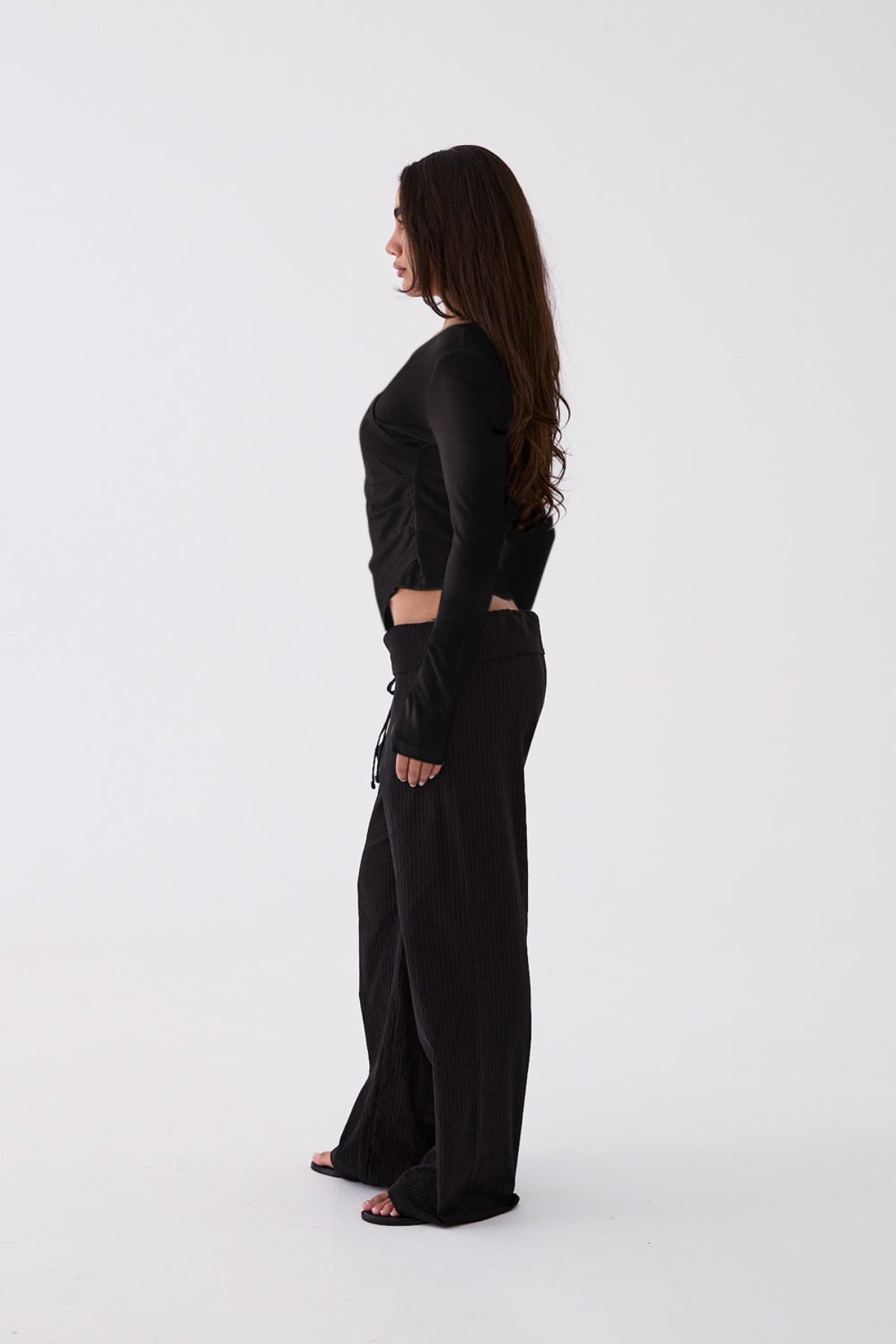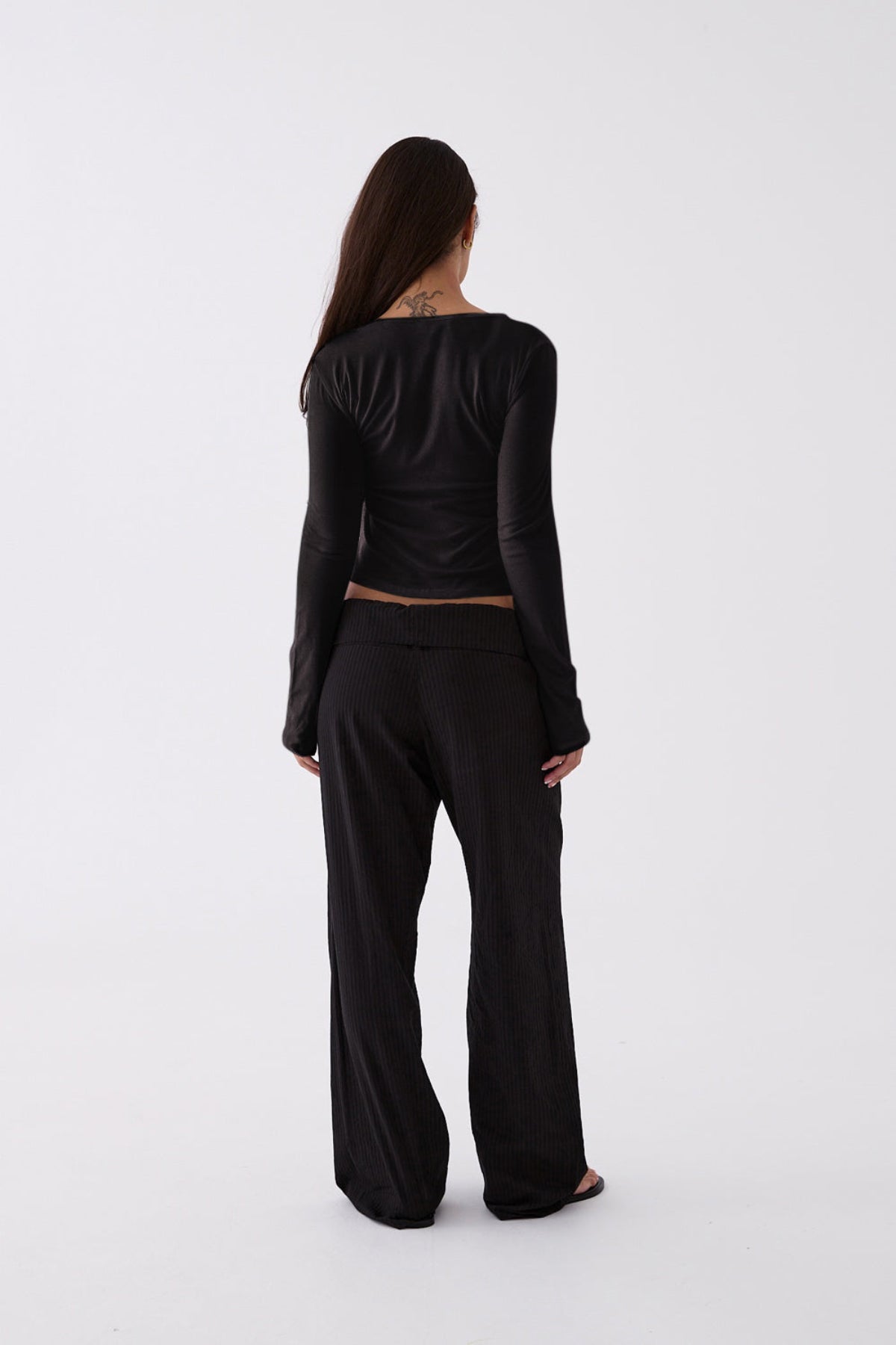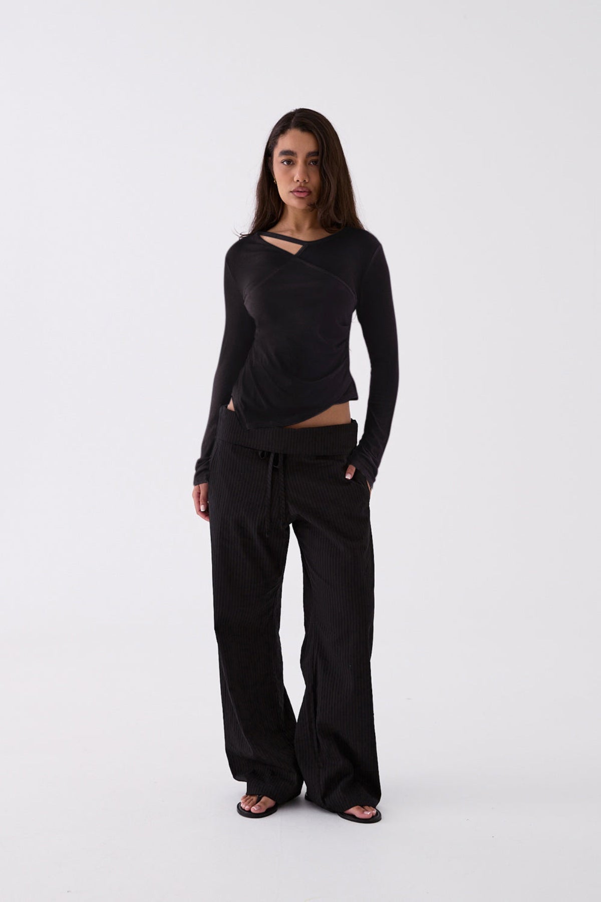 The Nori Top features a soft stretch fabrication, asymmetrical hemline, and subtle wrap-style front that contours the body.