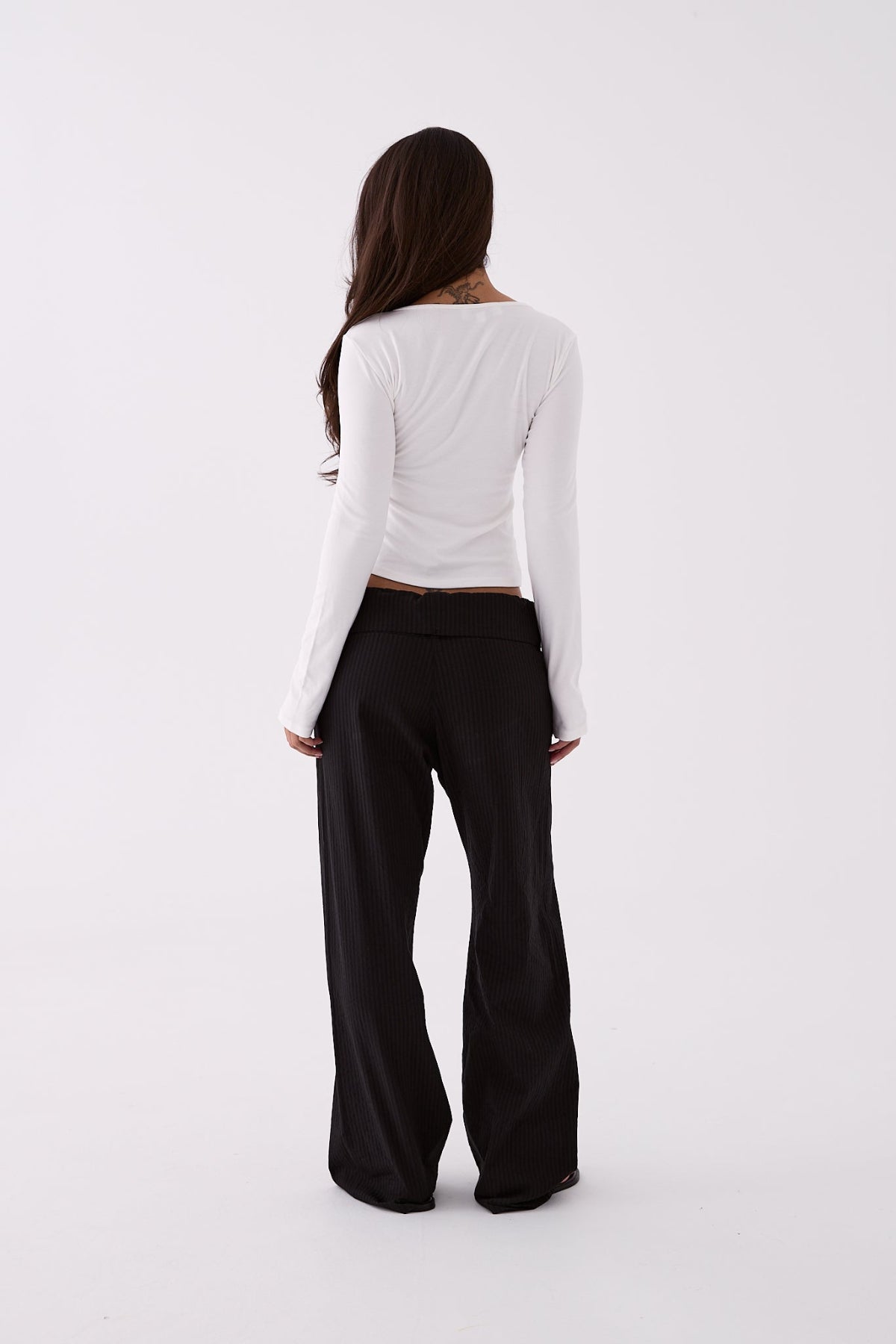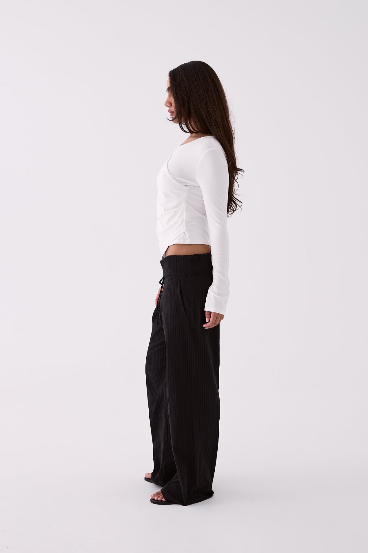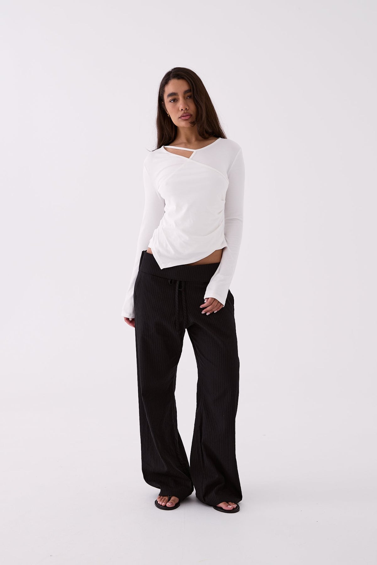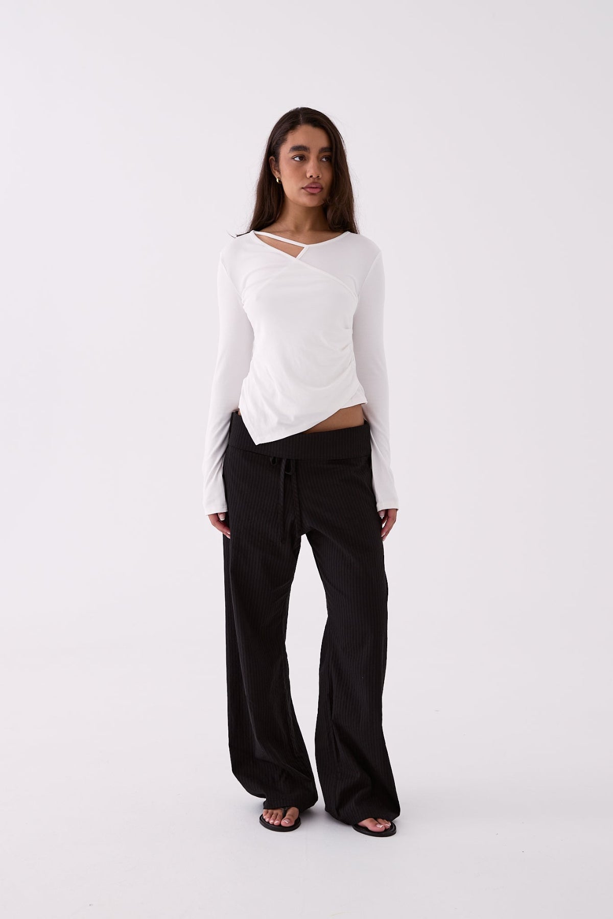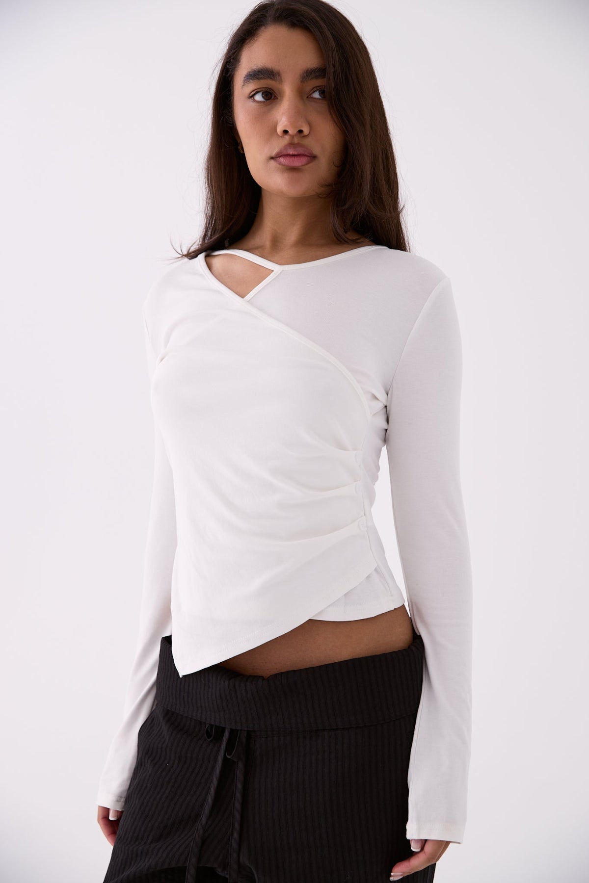 The Nori Top features a soft stretch fabrication, asymmetrical hemline, and subtle wrap-style front that contours the body.