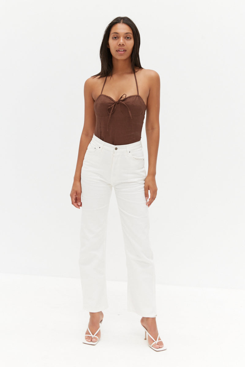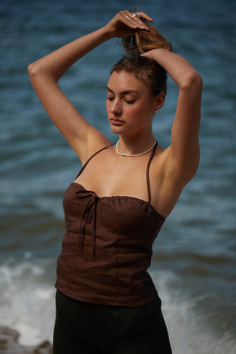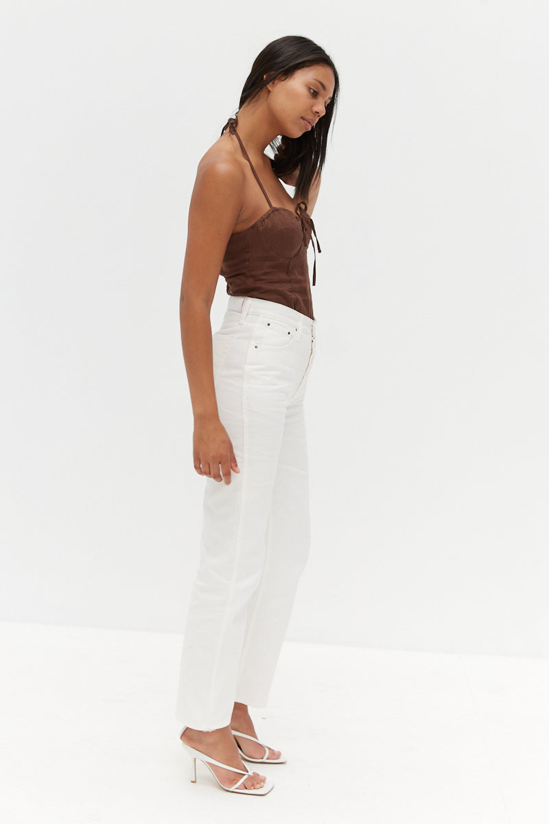 This vintage inspired bodice top was made for your vintage denim. The Palermo Top features linen material, elasticised back with hidden zip closure adjustable tie front and straps. This top can be worn as a halter or with straps. Worn here with: CORE Straight Leg Jeans.