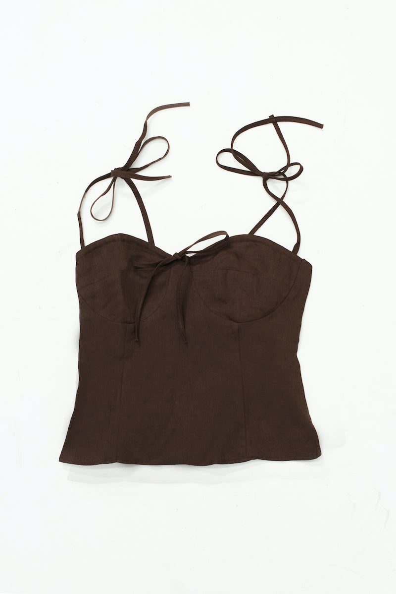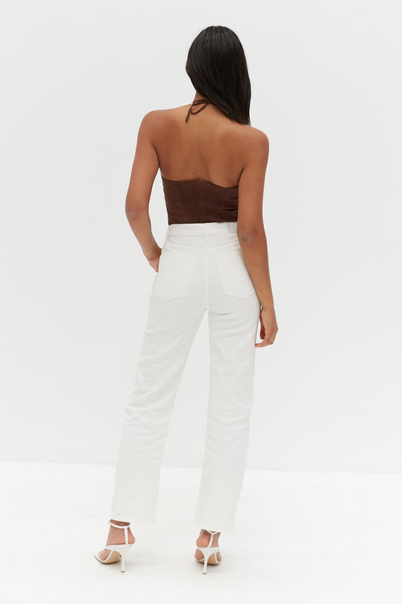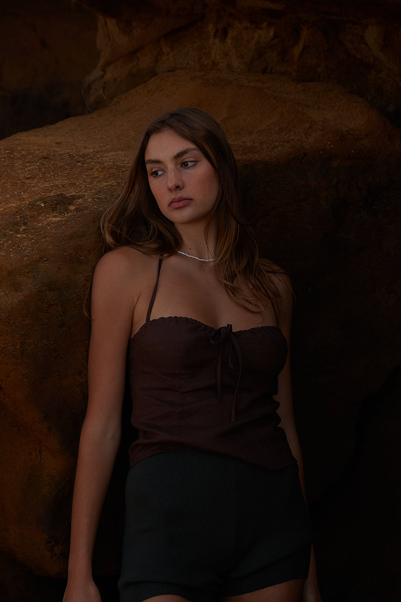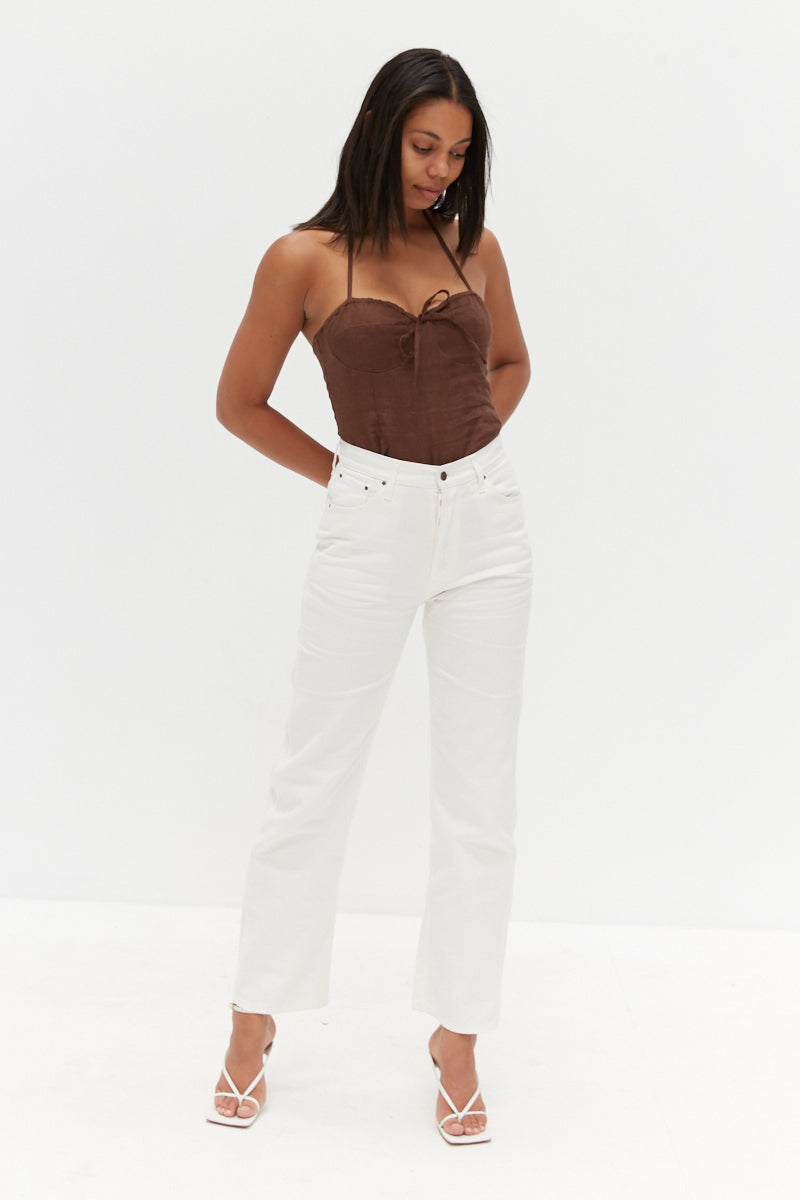 This vintage inspired bodice top was made for your vintage denim. The Palermo Top features linen material, elasticised back with hidden zip closure adjustable tie front and straps. This top can be worn as a halter or with straps. Worn here with: CORE Straight Leg Jeans.