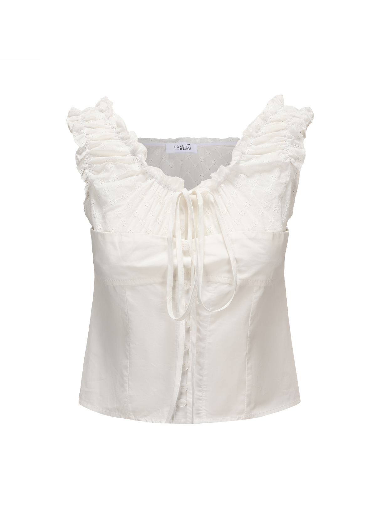 Introducing our Romy Top, a little white cotton top with lace sleeve detail. This button-front top offers versatility and can be worn on or off the shoulder, with an adjustable neckline for your desired style.