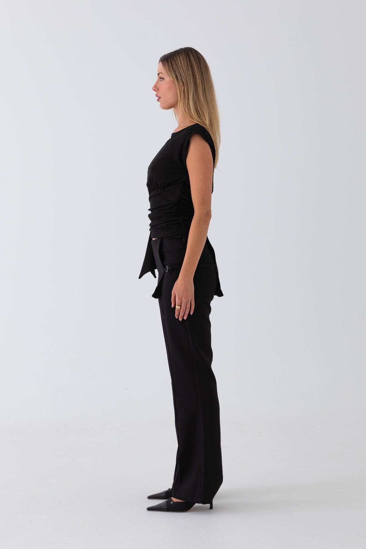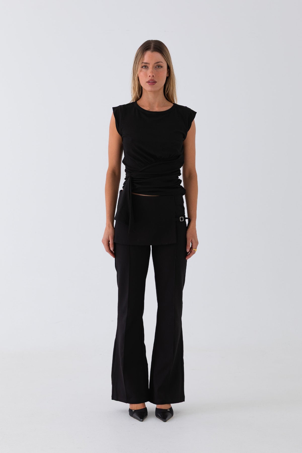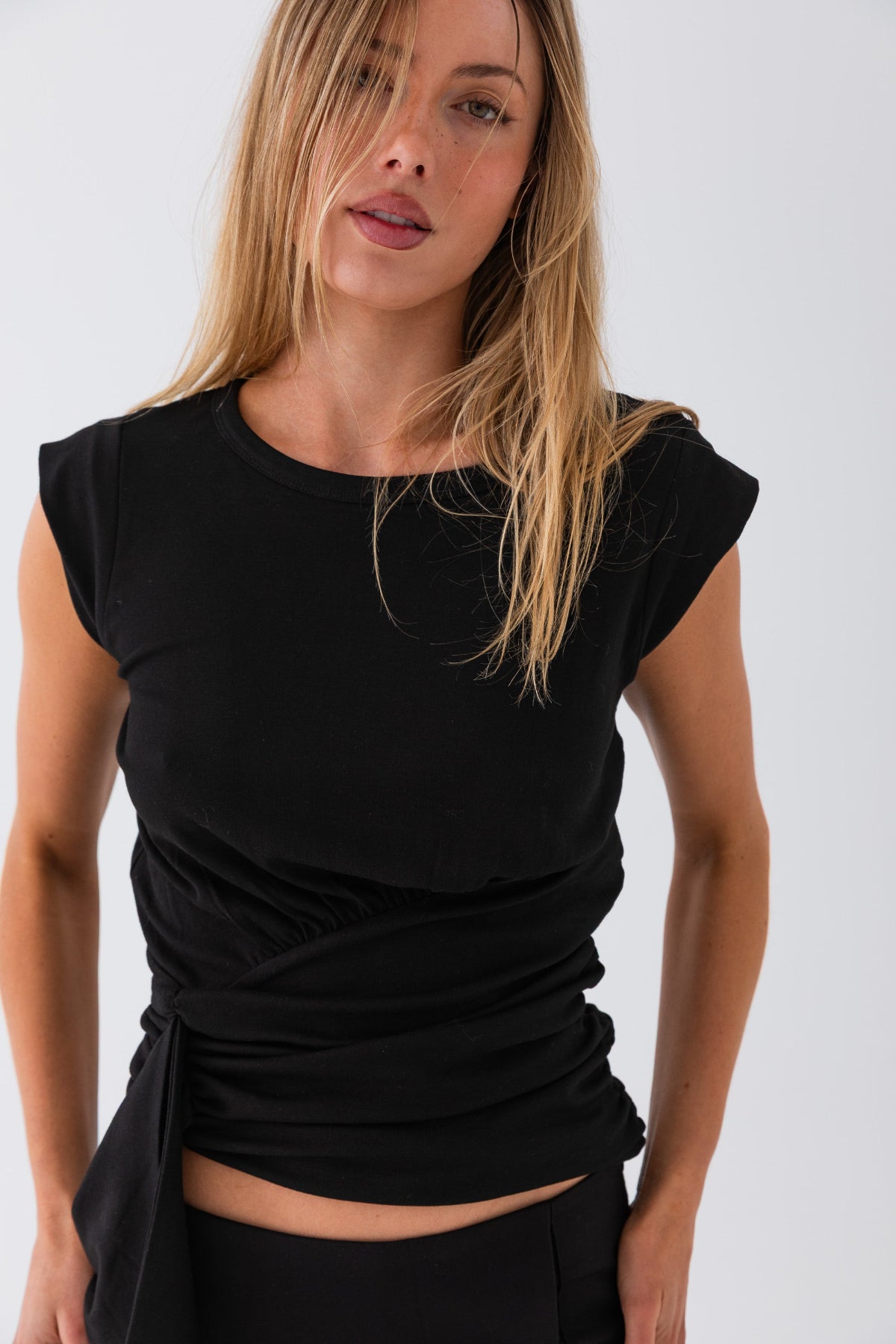 The Sandro Top features an asymmetrical wrap detail with soft side gathers and an extended tie. Made from stretch cotton jersey with a hidden side zip for a smooth, close fit—style it with tailored trousers or low-rise denim.