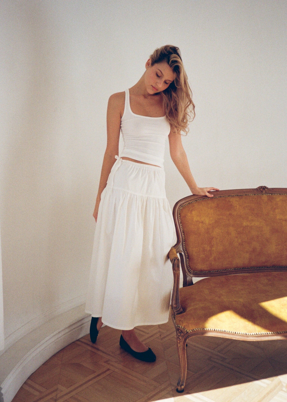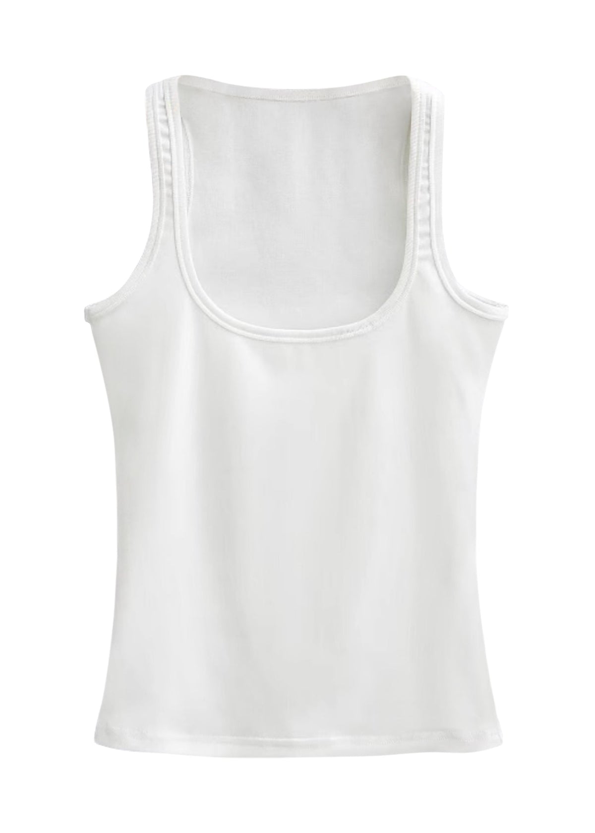Made from a ribbed material, this white scoop neck tank top offers a fitted silhouette that flatters any body type. Perfect for layering or wearing on its own, this classic tank is a versatile addition to any wardrobe.