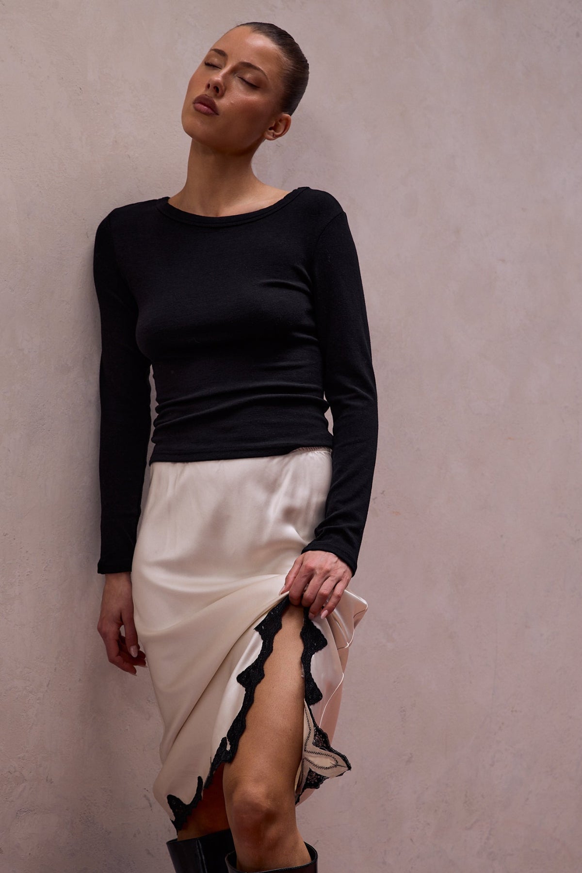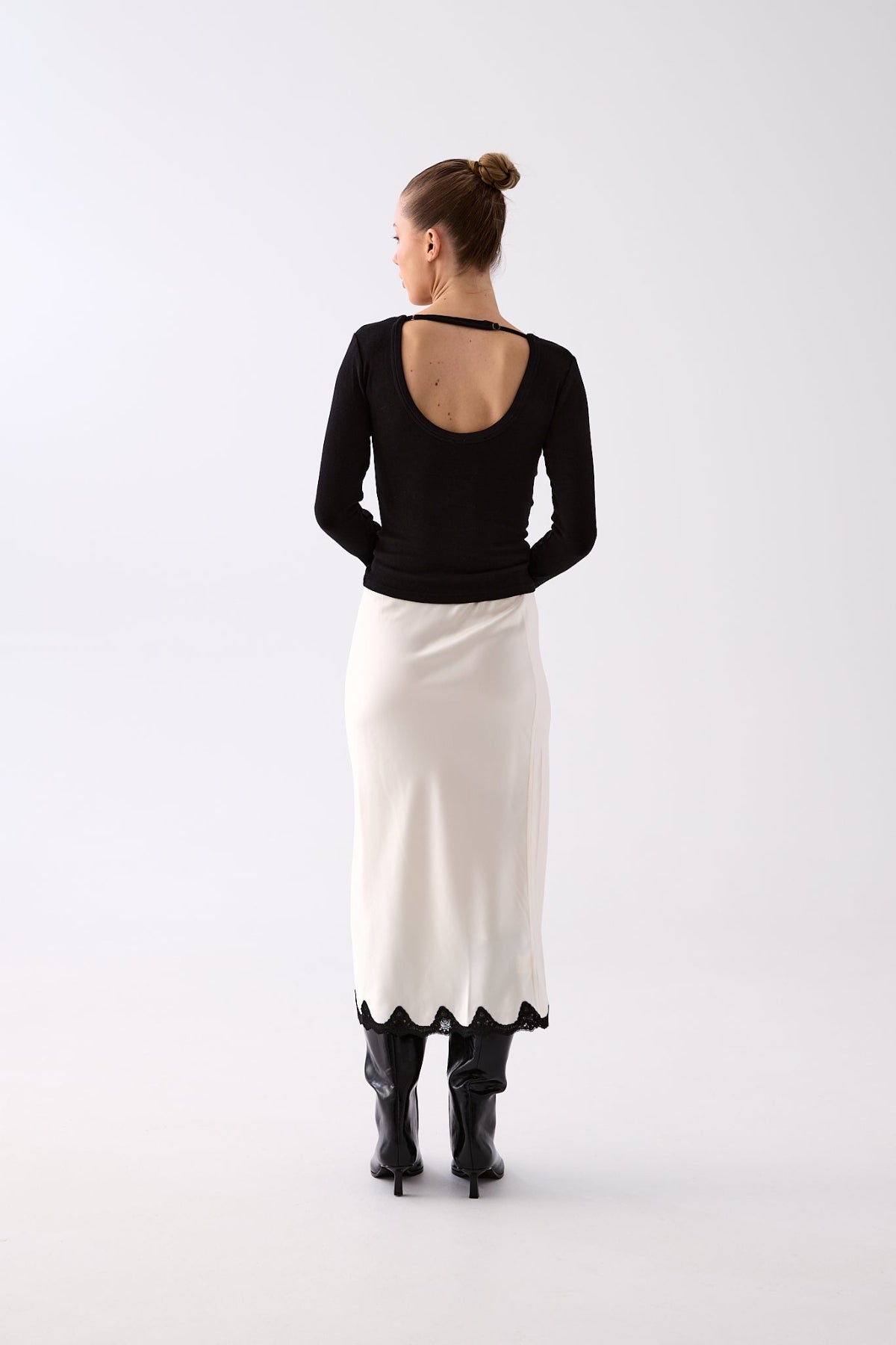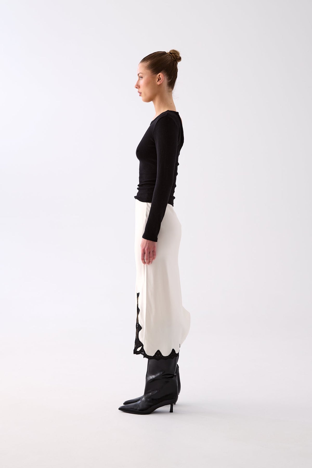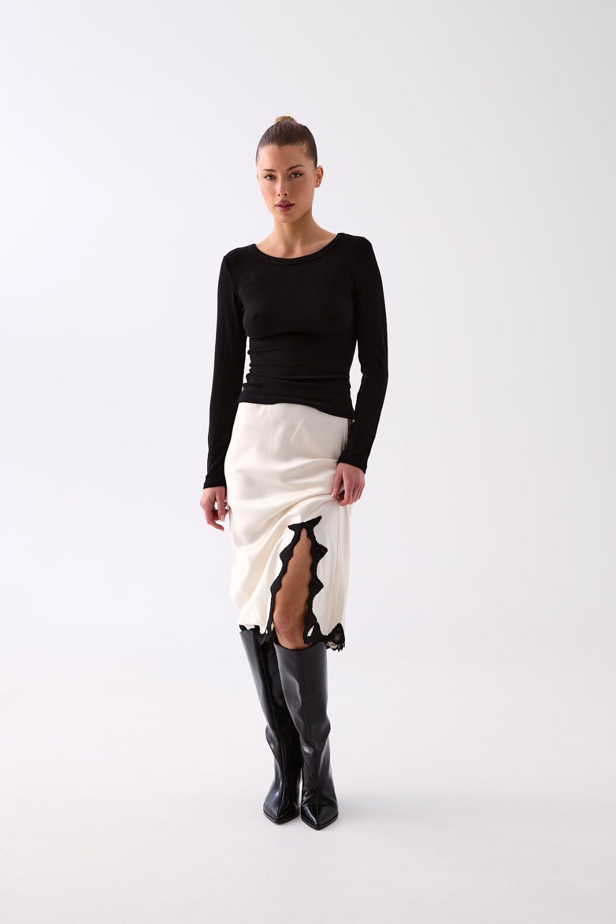 The Serena Satin Lace Trim Skirt is cut on the bias for a fluid drape that skims the body, finished with a delicate scalloped lace hem and side split for subtle texture and movement.