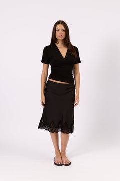 A refined essential with a soft, feminine finish. The Lace Skirt is cut on the bias to gently skim the body, falling into a fluid silhouette with a delicate lace-trimmed hem.