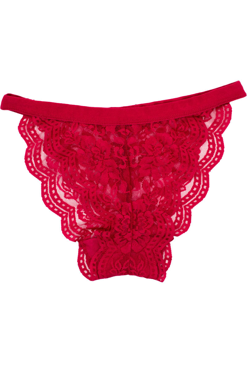 Brazilian style underwear in sheer red lace featuring thick strap detail. Pair with the matching Valentina Bralette.