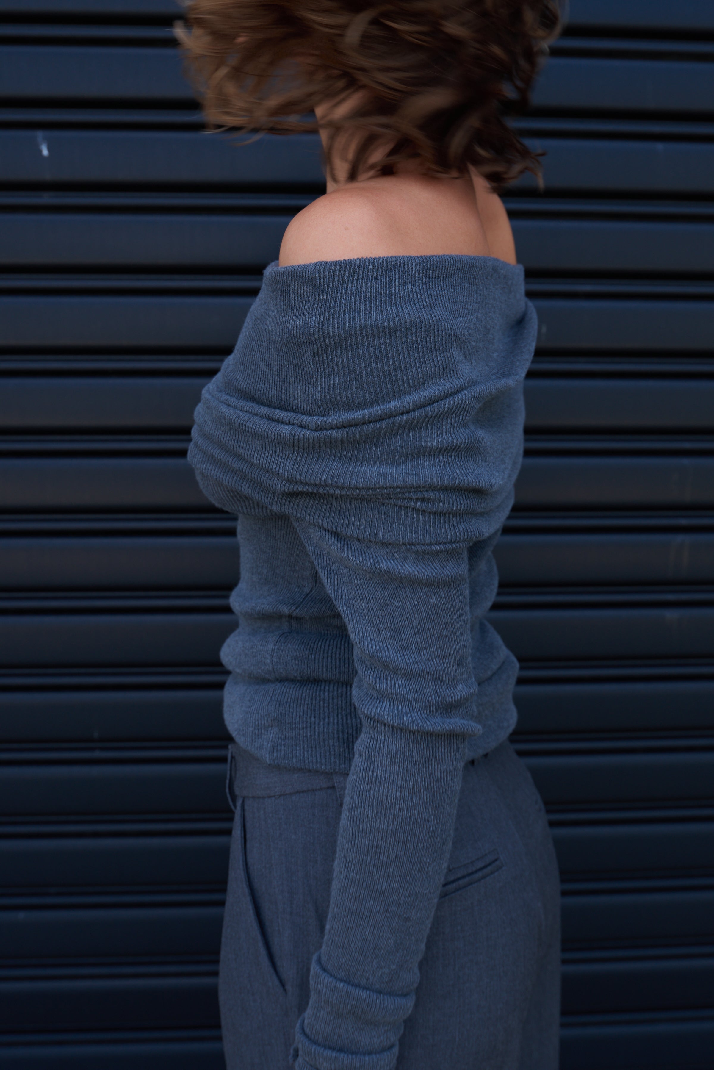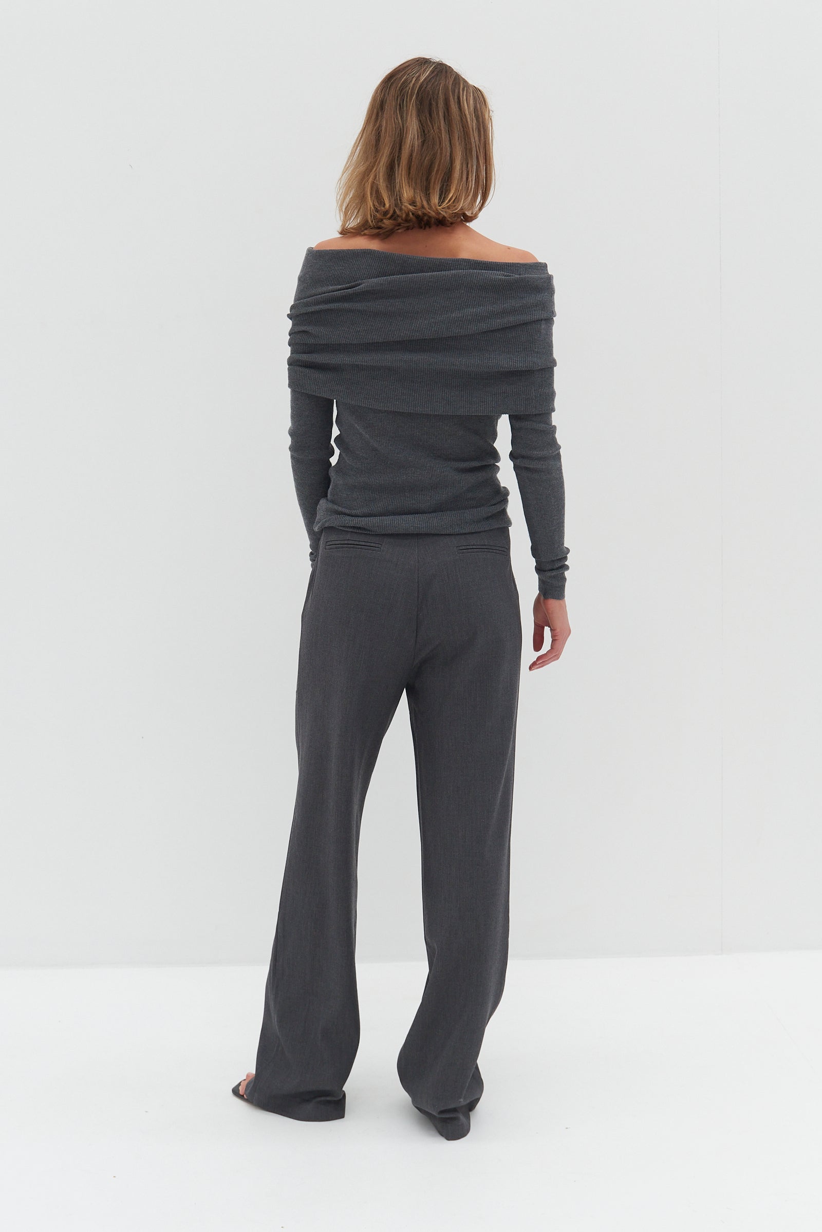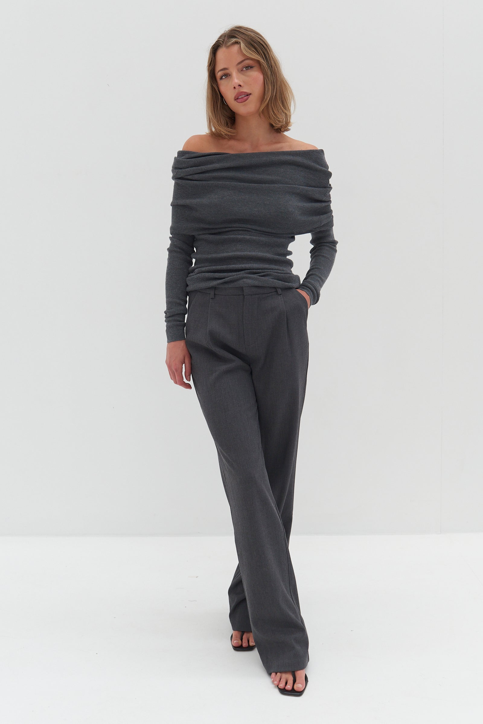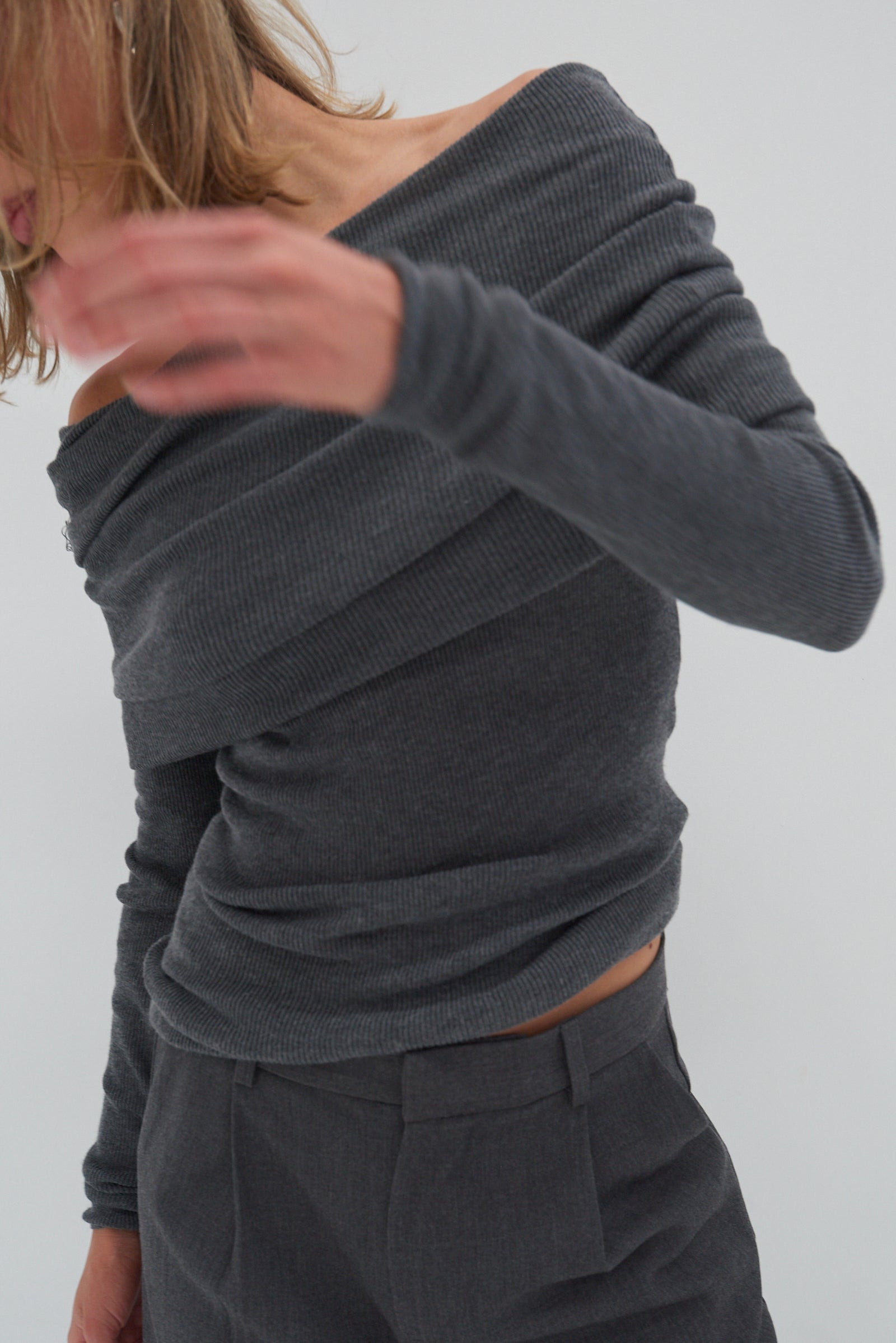 Our off-the-shoulder long sleeve top, introducing the Margot Top - Grey; featuring a roll-over neckline and made with ribbed knit material